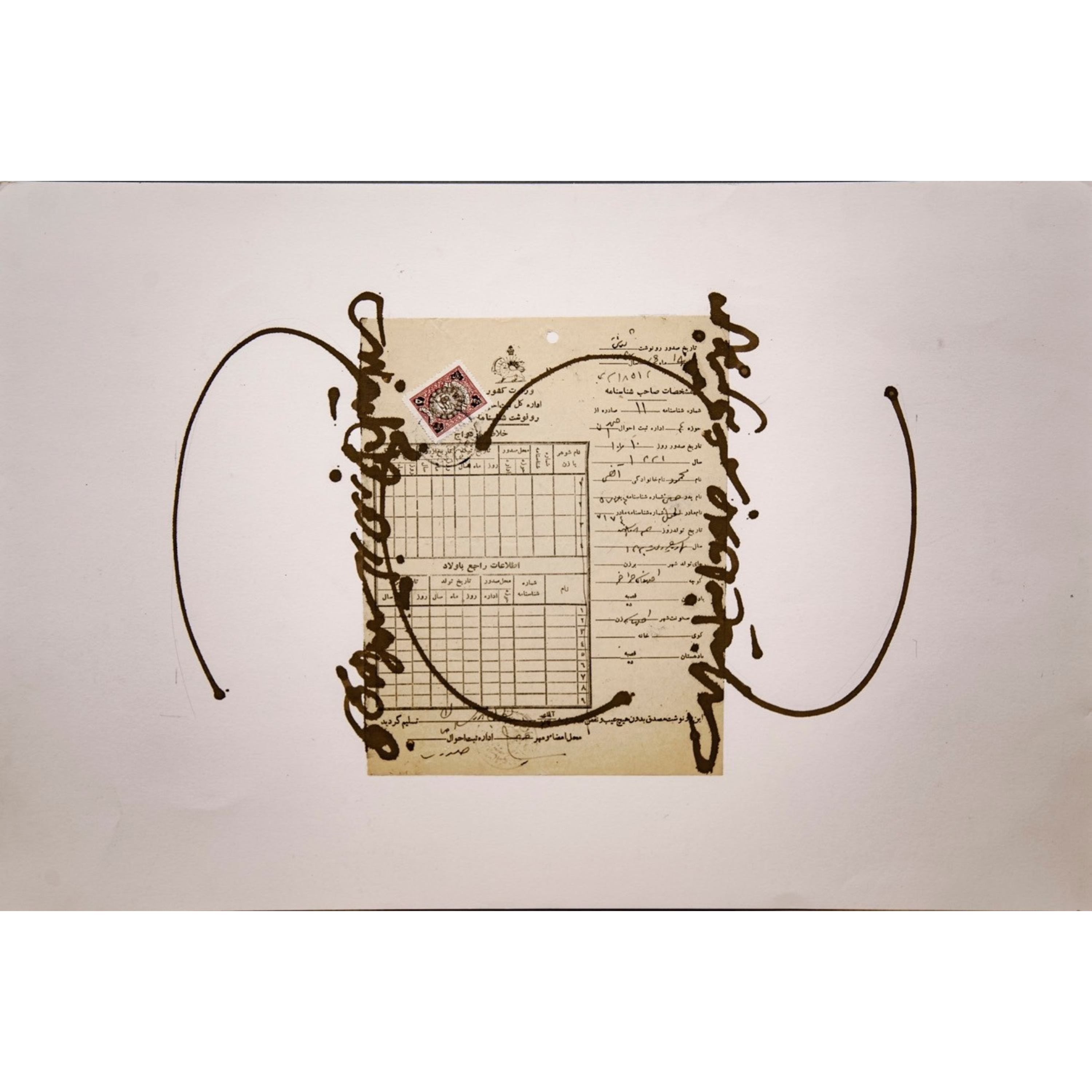 More Information: This is a one-of-a-kind mixed-media calligraphy piece, crafted with ink on cardboard and authentic vintage official documents from the Middle East. All reproduction rights are reserved by the artist.