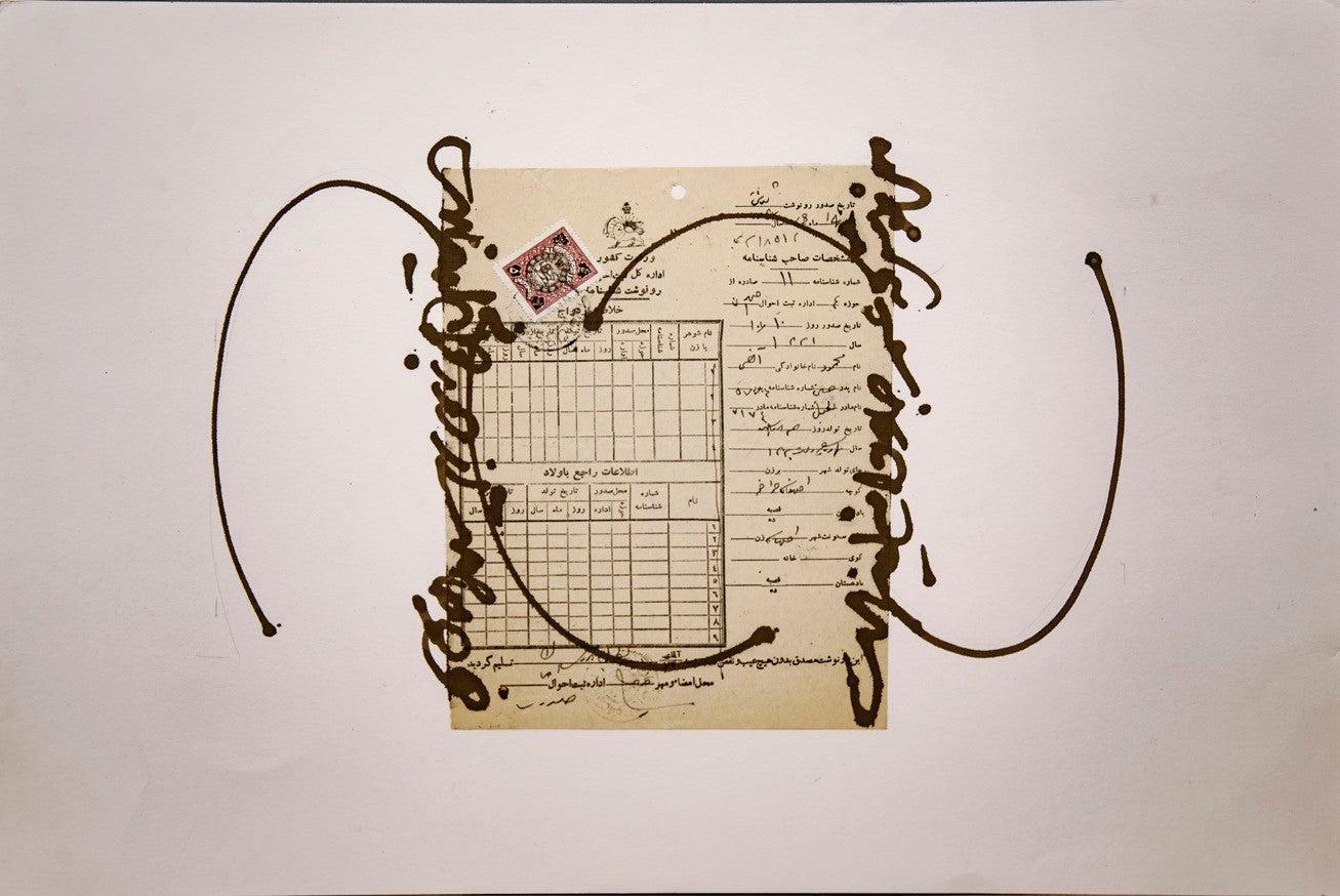 Medium: Mixed-media calligraphy (Ink on Cardboard and Vintage official Documents from the Middle East)