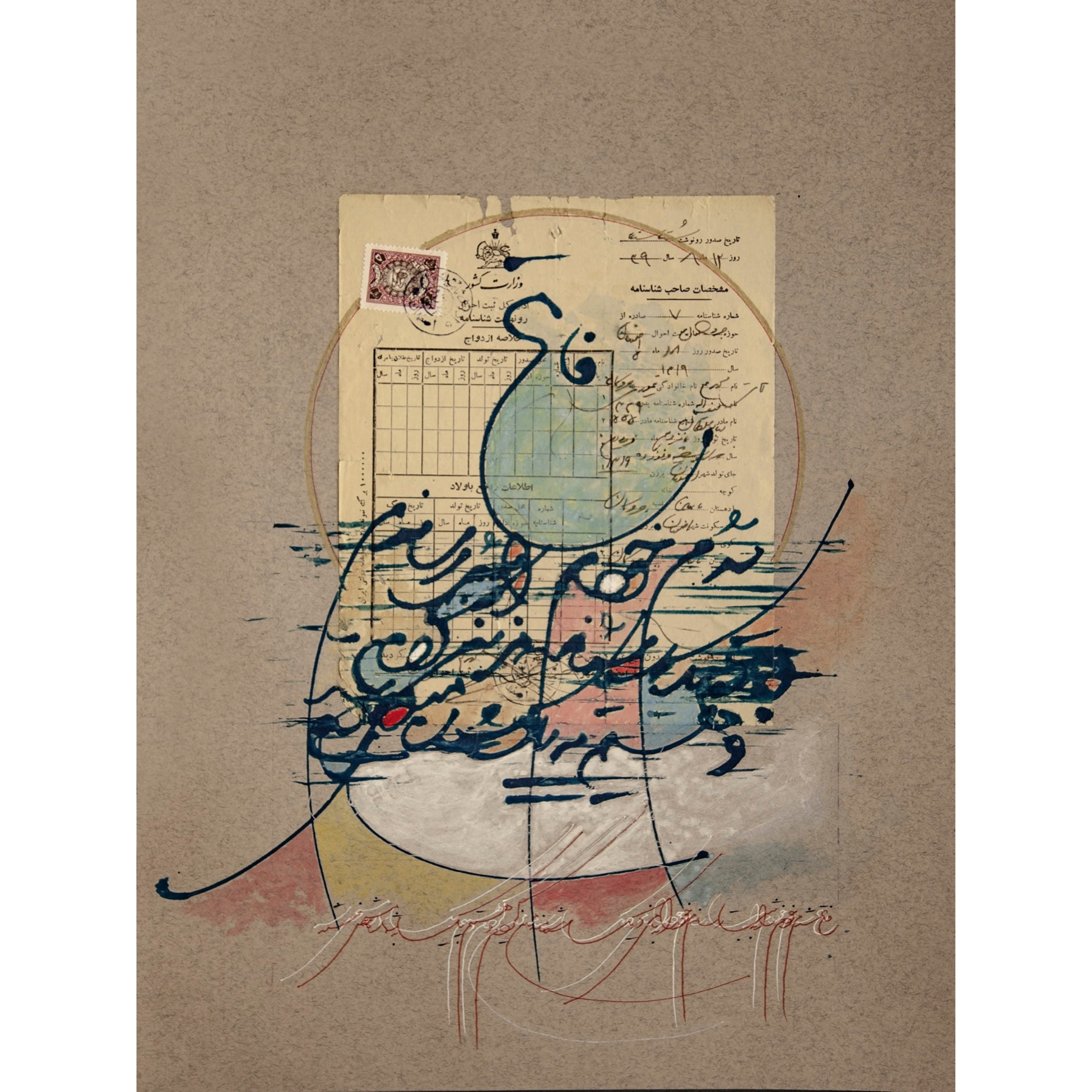More Information: This is an original mixed-media calligraphy artwork, a unique juxtaposition of ink on cardboard and vintage official documents from the Middle East. Artist retains all rights of reproduction.
