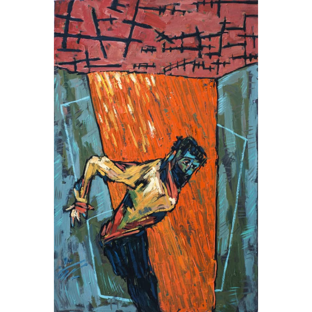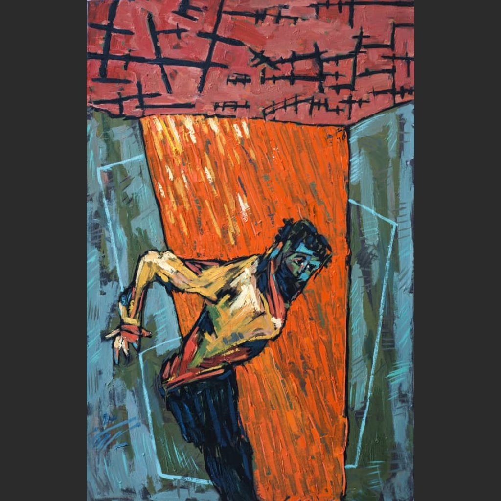 Description: In Against the Wall, a lone figure bends under an unseen weight, arms pulled behind, caught between confinement and defiance. The harsh orange and red backdrop contrasts with the weary posture, suggesting a burden carried silently, perhaps the emotional or societal weight of existence. Sirvan Kanaani conveys a powerful sense of pressure and perseverance, and the geometry of space mirrors the figure's mental entrapment.