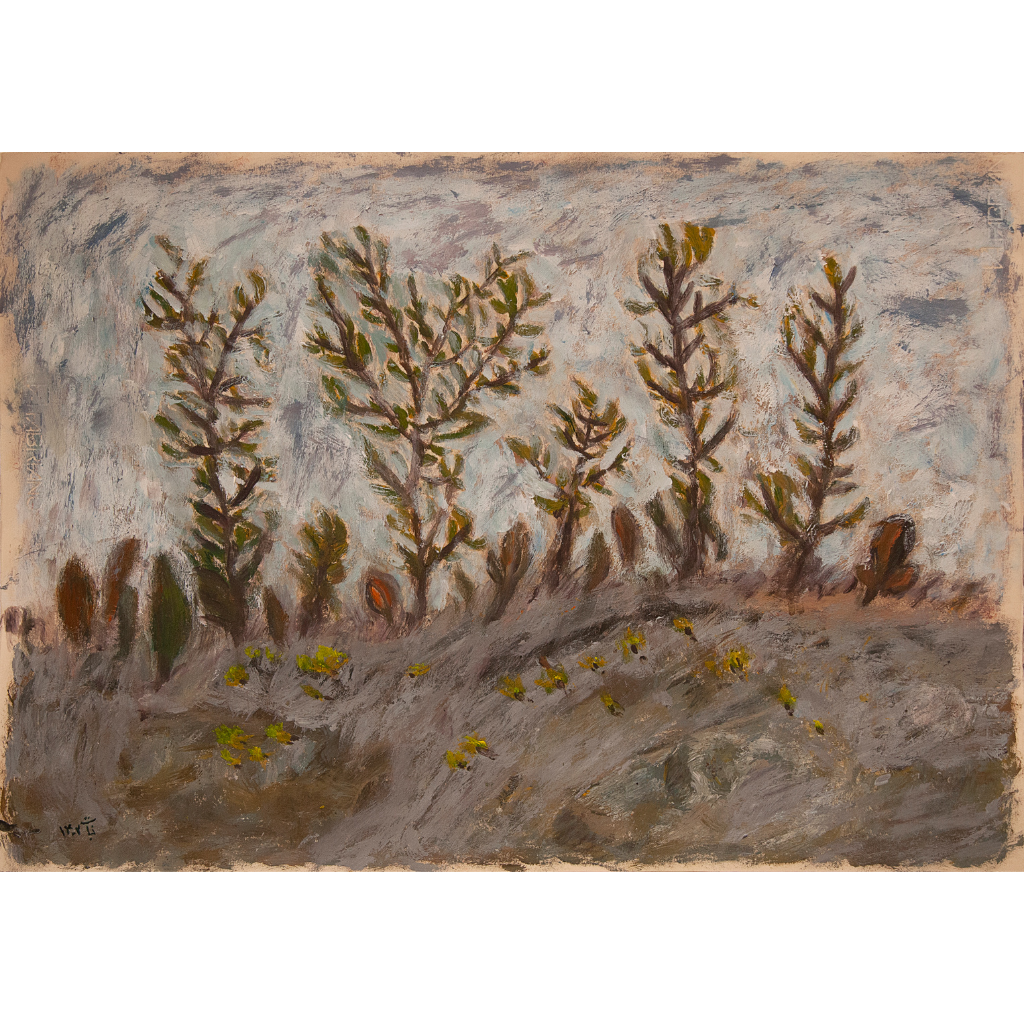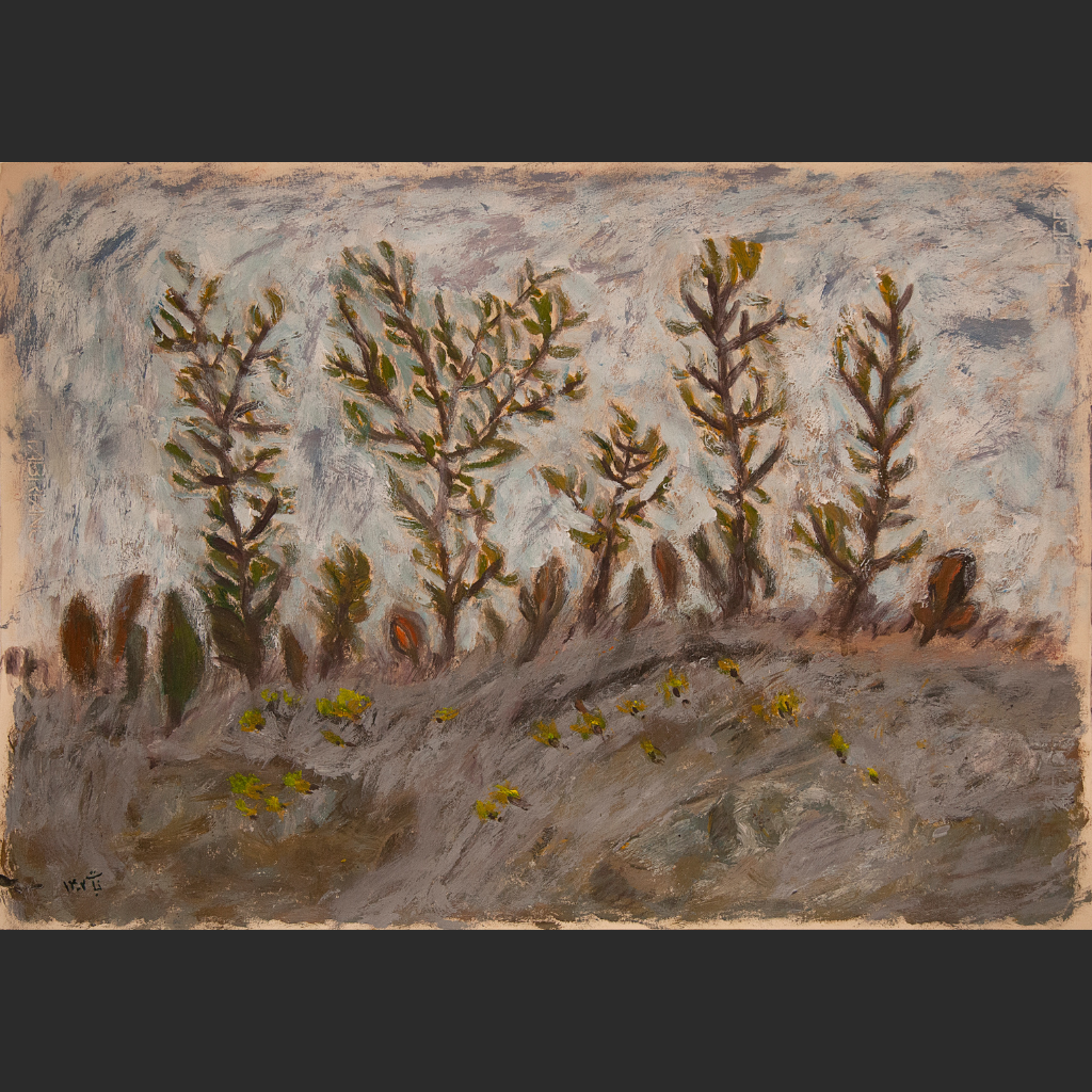 Description: In Before the Bloom, Elahe Khosravi presents a scene of early growth and quiet anticipation. Sparse trees stretch upward under a pale sky, while small yellow buds peek from the earth below. With her signature textured strokes and earthy tones, the artist captures a gentle moment just before nature awakens.