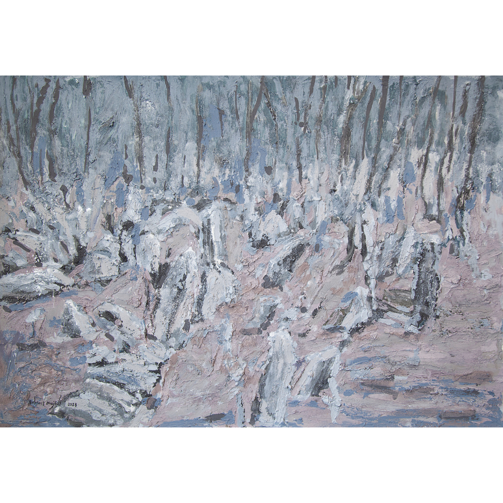 Description: In Beneath the Pale Silence, Behrouz Majidi renders a haunting forested scene, where stone-like figures appear to emerge from the earth. Using subdued tones of Gray, lavender, and icy blue, he evokes a quiet, otherworldly atmosphere. The dense composition blurs the line between natural form and abstraction, memory and matter. Each brushstroke carries weight as if pressing time itself into the surface. The result is a visual meditation on presence, stillness, and the quiet persistence of place.