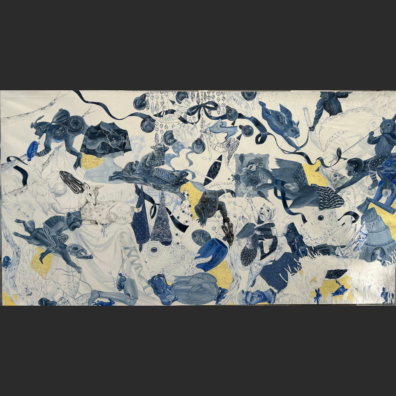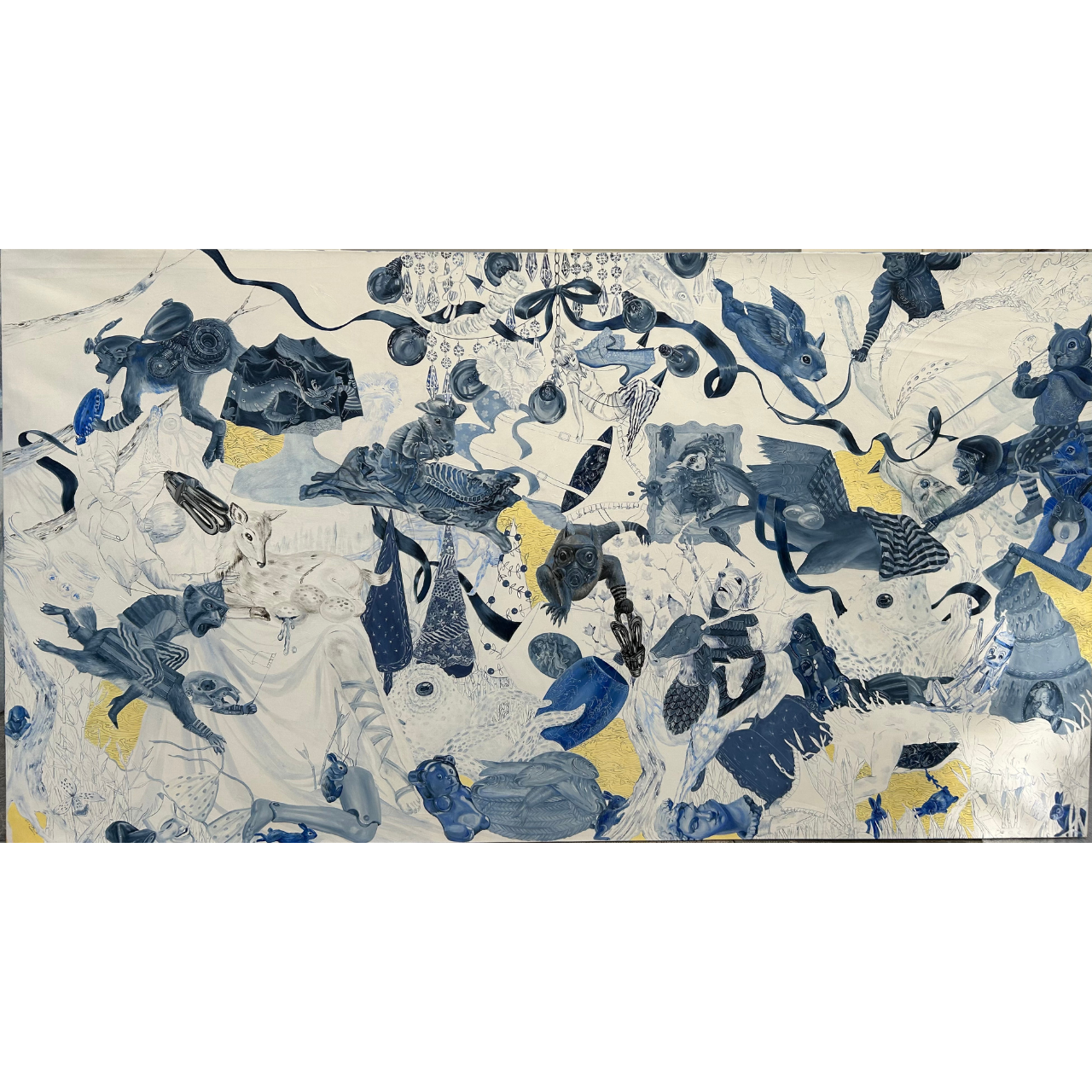 Description: Surreal creatures, fantastical masks, and fragmented bodies swirl across a sea of unfinished linework and pools of yellow light. “Blue 001” invites viewers into a dreamscape of control and chaos, where memories emerge and dissolve simultaneously.
