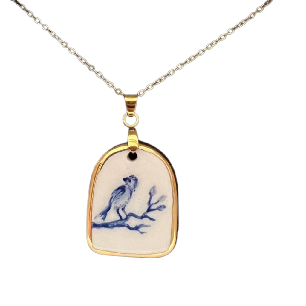 Additional Info: Each item in this set — the necklace and earrings — can be ordered individually. Hand-painted in serene blue tones, the design features a songbird perched on delicate branches, evoking peace and poetic simplicity.