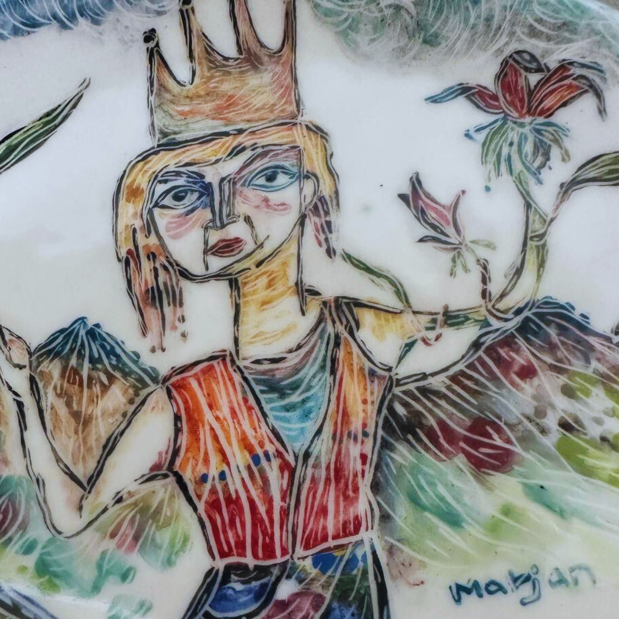 Marjan’s distinctive style is evident in the vibrant colors and intricate patterns that adorn the surface of the plate. The modern glaze painting technique she employs brings a luminous quality to the design, ensuring that each brushstroke shines with brilliance and depth. The circular form of the plate adds a sense of balance and unity, while the intricate motifs reflect her deep connection to cultural heritage and her innovative approach to ceramic art.