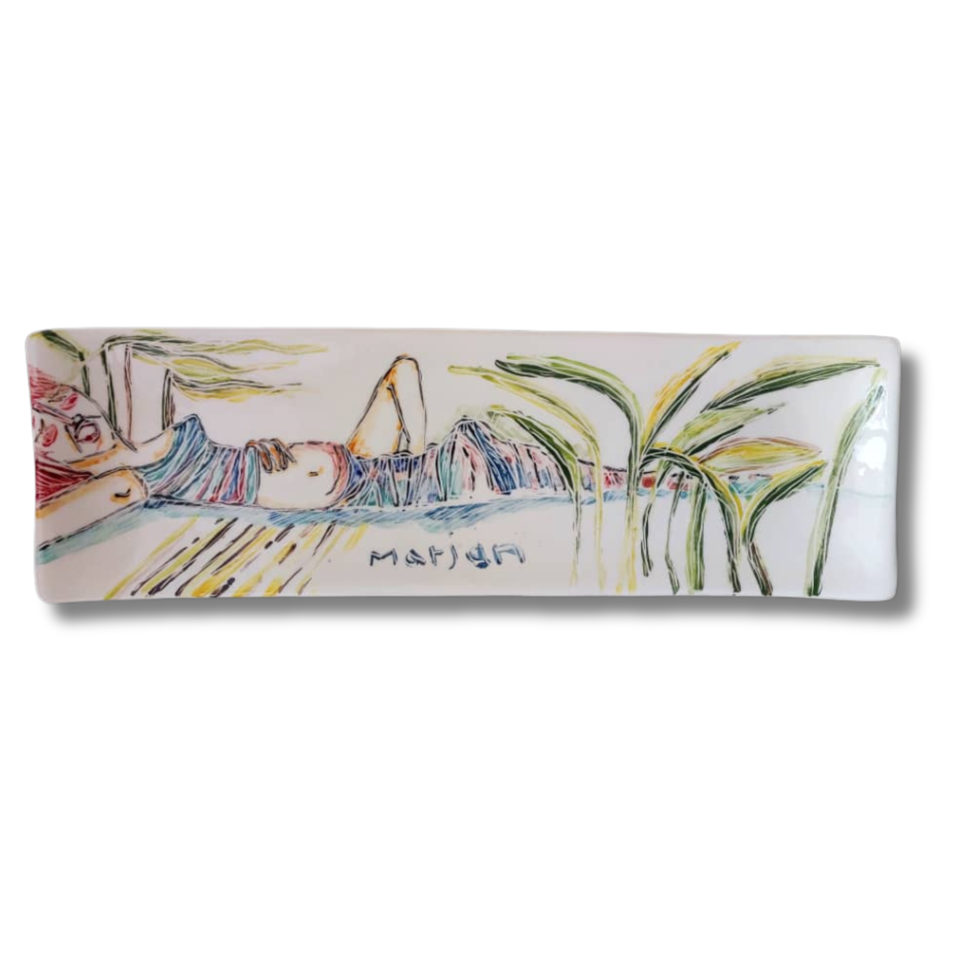This elongated ceramic artwork by Marjan Andaroudi is a unique, single-edition piece that showcases her exceptional talent in underglaze painting. Measuring 11 × 36 cm, the piece is crafted from earthenware and features a captivating blend of intricate patterns and vibrant colors. Weighing approximately 542 grams, the artwork is both substantial and elegant, making it a striking addition to any space. Marjan’s signature style is evident in the detailed motifs and flowing lines that adorn the surface, reflecting her deep connection to cultural heritage and contemporary artistry.