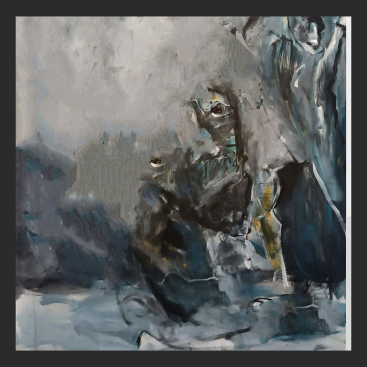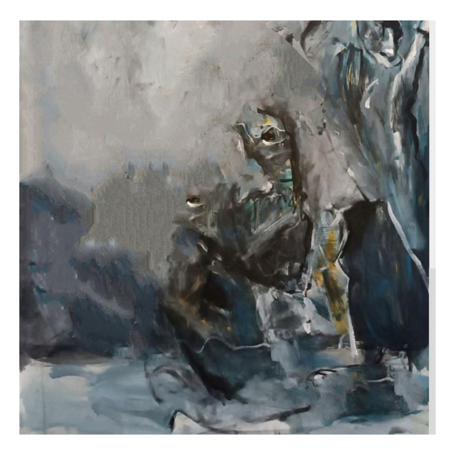 Description: A sea of muted blues initially suggests serenity, but closer inspection reveals polluted greys and ghostly hues that shift the atmosphere. The background becomes a space of emotional tension, guiding the viewer into a fragmented, unstable world. Despite the dissonance, there is a quiet pull toward meaning, or perhaps, toward memory.