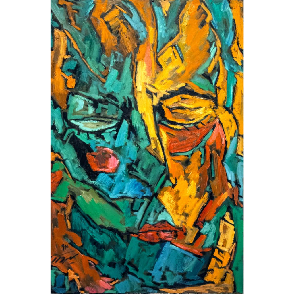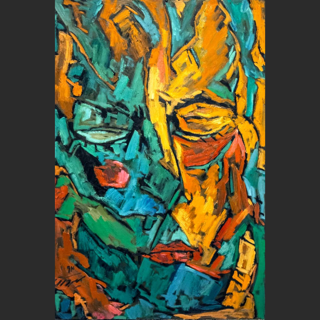 Description: Dialogue in Color captures a singular, fractured face rendered in vivid green, orange, and teal strokes. Rather than separating into multiple figures, the features seem to shift and multiply within one face, like different voices or moods speaking at once. This inner dialogue emerges through fragmented forms and layered hues, revealing a psyche in motion, conflicted, expressive, and searching.