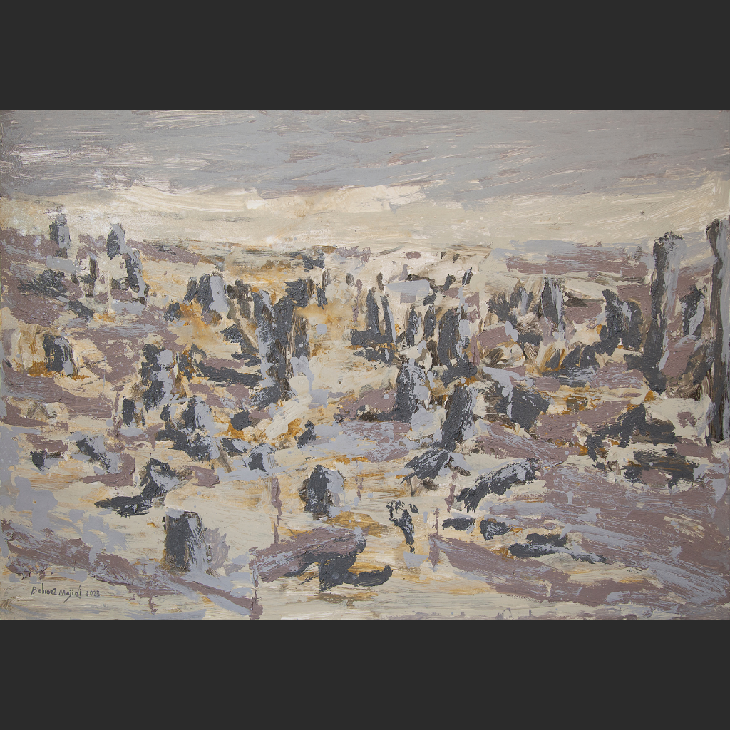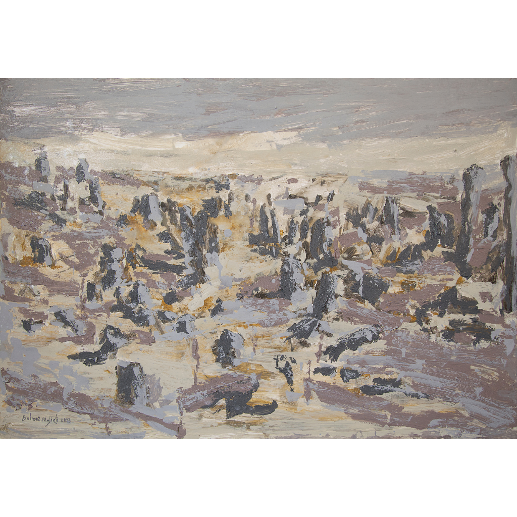 In Echoes of a Silent Terrain, Behrouz Majidi constructs a fragmented landscape through bold, textured brushstrokes and a palette of muted greys, browns, and ochres. The surface feels weathered and raw, evoking the remnants of a forgotten place — perhaps a desolate cityscape or a once-inhabited land now reclaimed by silence. The painting captures a powerful sense of stillness, where memory and erosion meet. With each layer, the viewer is invited to wander through a terrain shaped by time, absence, and quiet persistence.