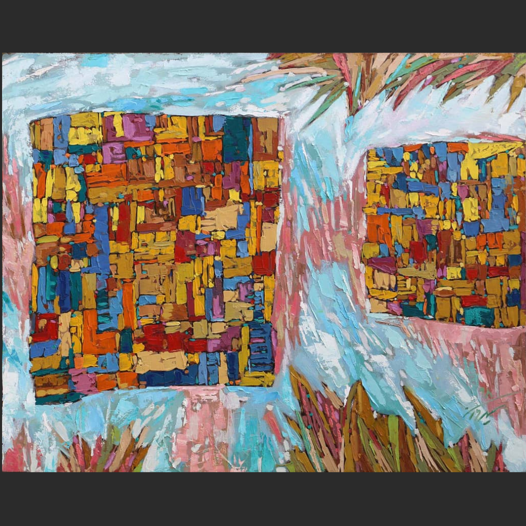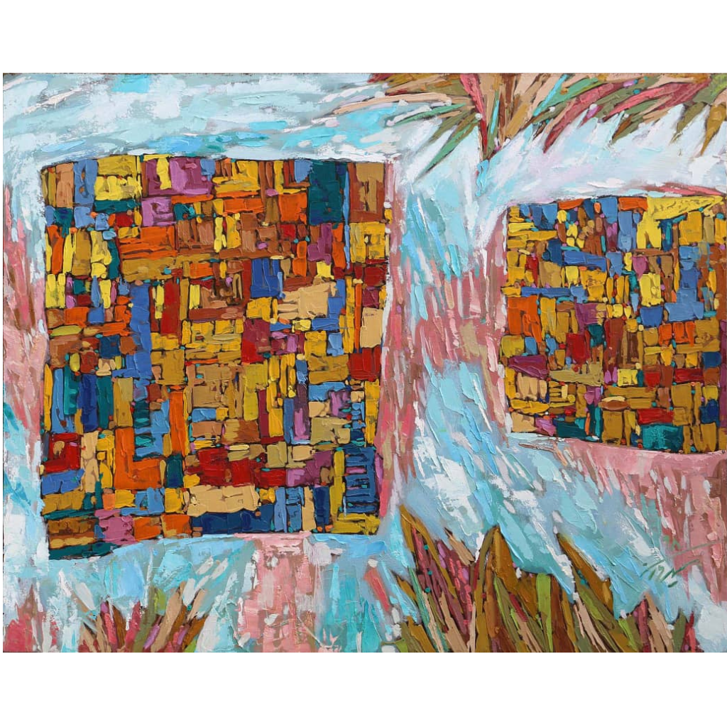 Description: This composition by Sirvan Kanaani juxtaposes two vibrant grid-like forms, hovering in a dreamlike, pastel-toned landscape. The rhythmic mosaic of color blocks evokes architecture and memory, suggesting walls, windows, or woven patterns, while the gestural brushwork breathes movement into the space between them. The piece captures a tension between structure and emotion, order and expression.