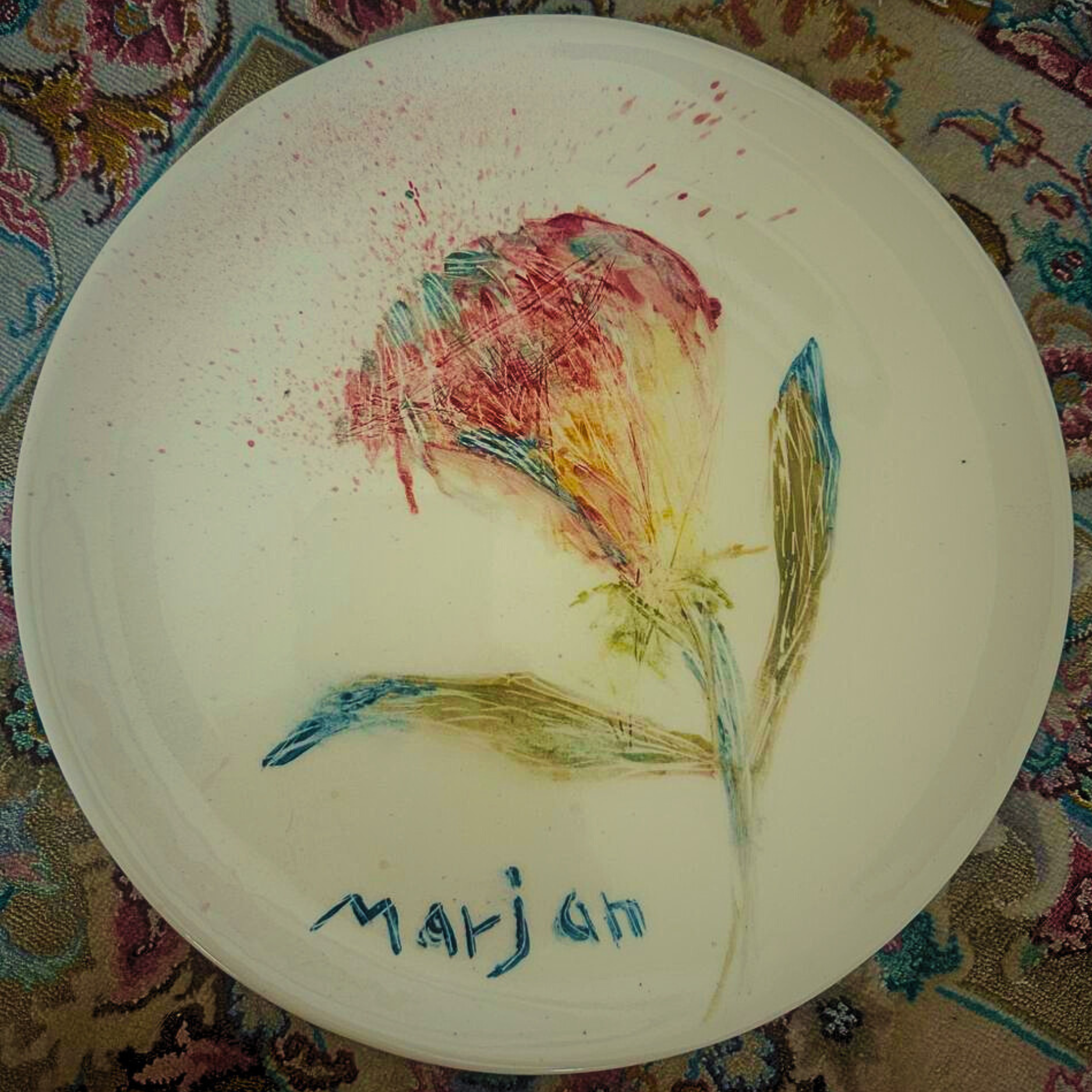 The circular form of the plate is both symbolic and functional, representing unity and harmony while serving as a canvas for Marjan’s artistic expression. The balance between the bold scale of the piece and the delicate detailing of the patterns showcases her exceptional skill and attention to detail.