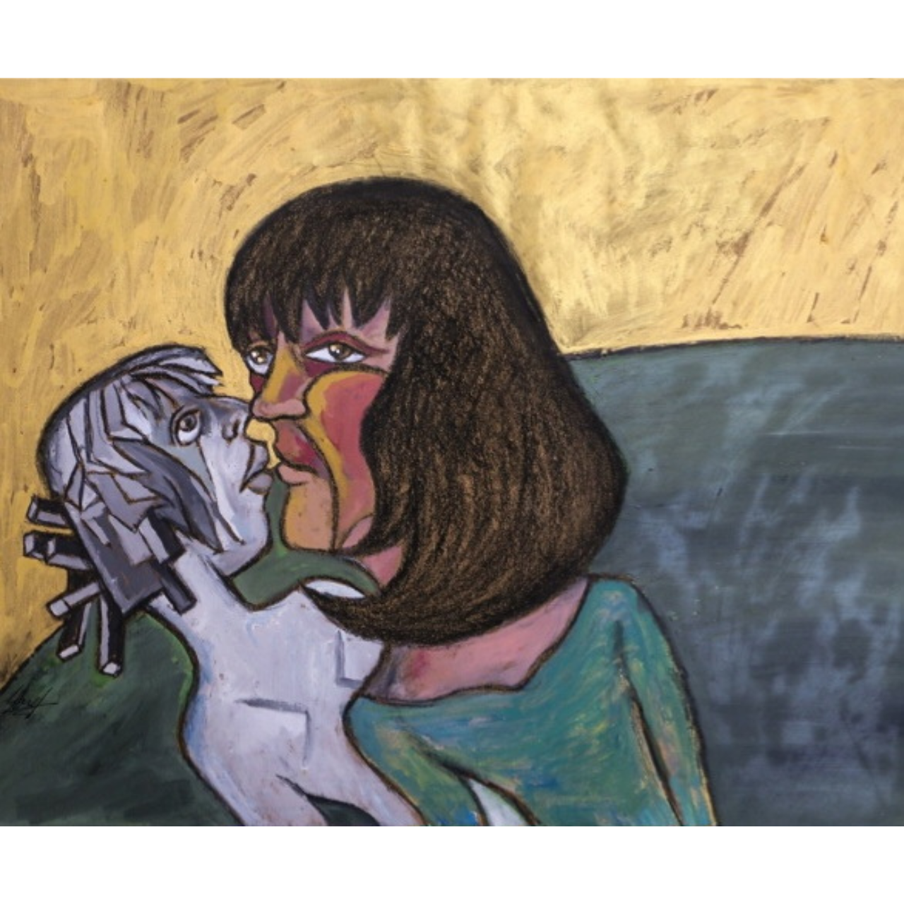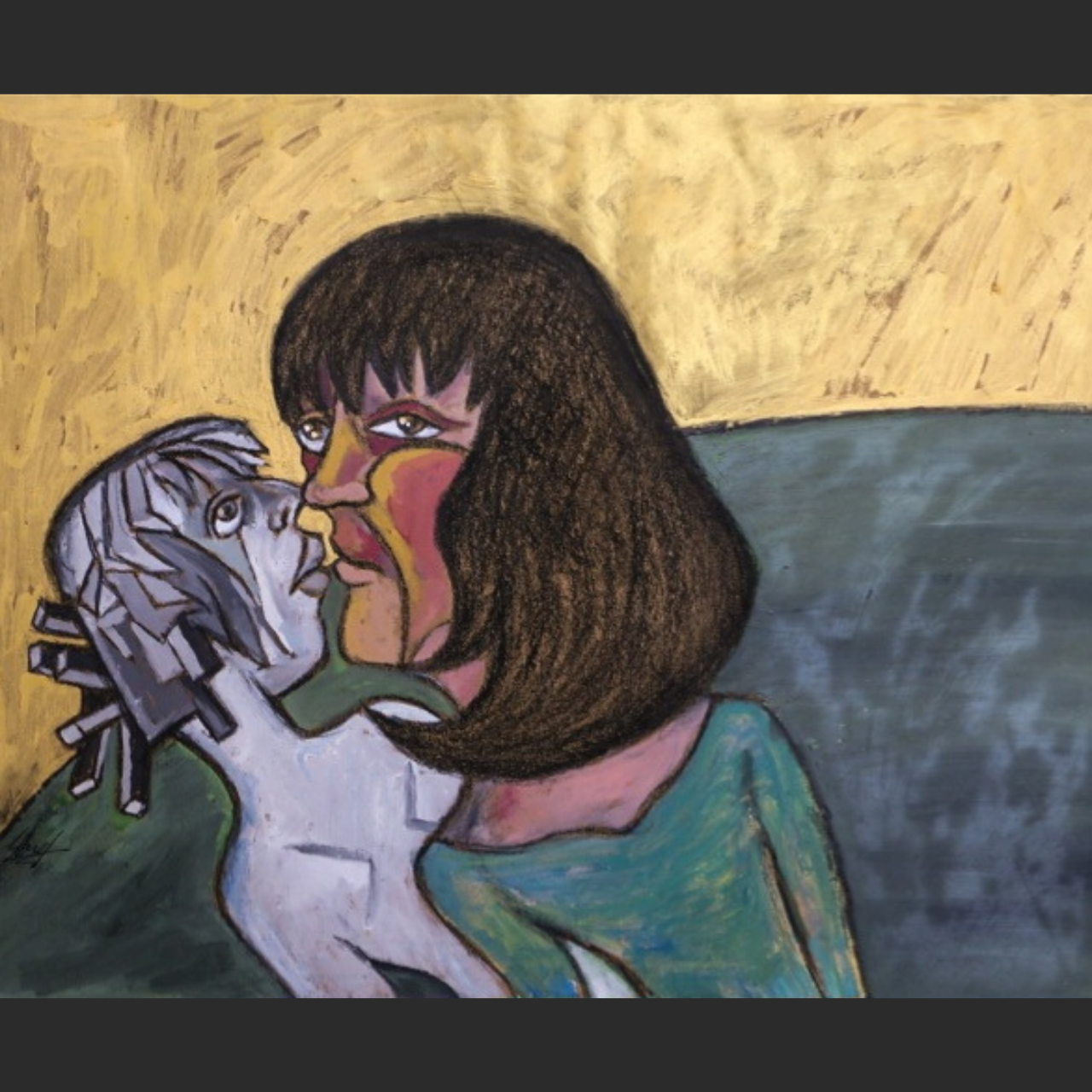 Forbidden presents a raw, expressionist portrayal of emotional tension and suppressed desire. With bold outlines and distorted forms, the painting depicts a woman confronting an abstract, puppet-like figure possibly a projection of inner conflict or societal restriction. The direct gaze and exaggerated facial features speak to resistance and longing. Aeeni’s style here leans into symbolic minimalism, using contrast and posture to question power, intimacy, and boundaries.