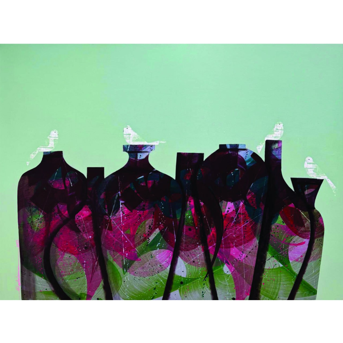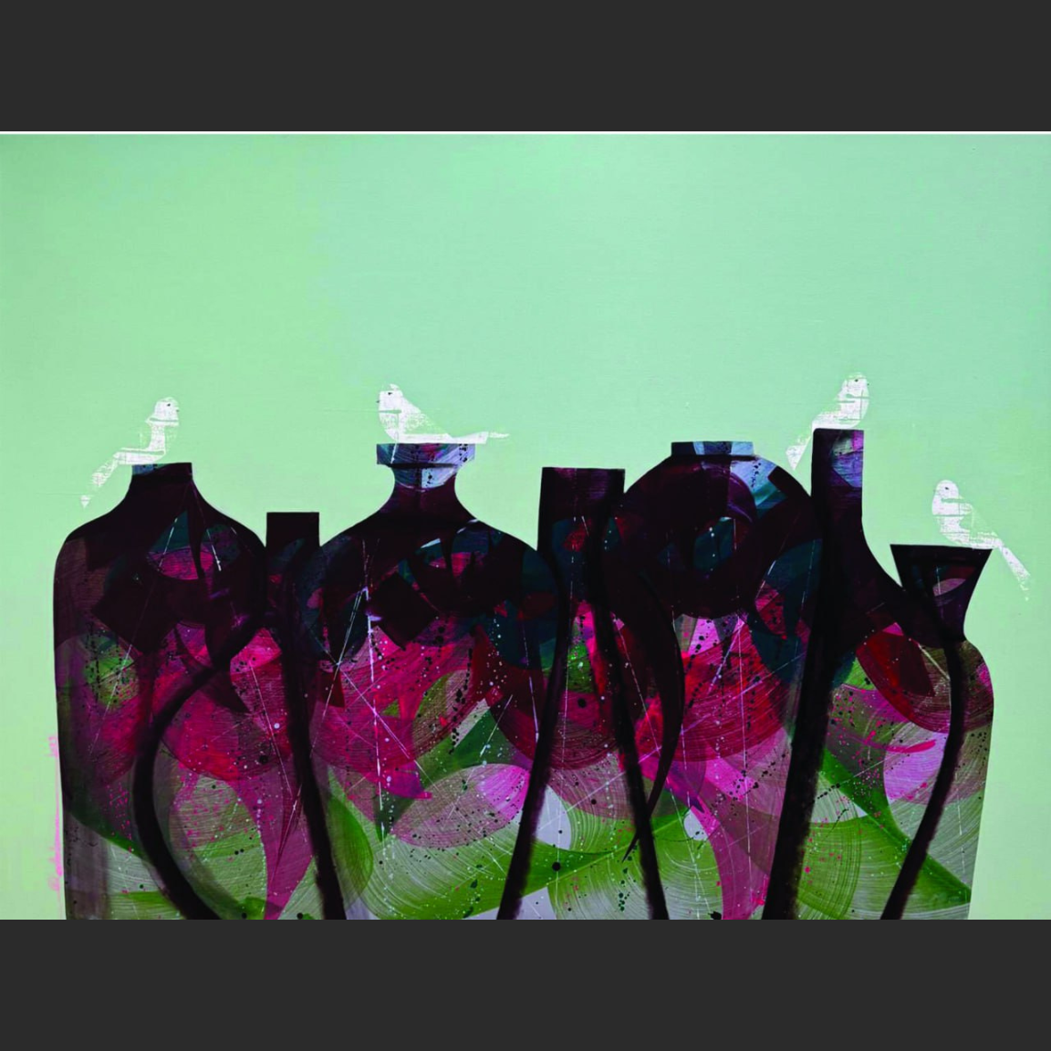 Description: This work blends abstraction with decorative symbolism, merging modern visual language with echoes of Persian tradition. Rich crimson and teal vessels are enlivened by gestural marks and layered media, while translucent glazes and opaque overlays create a dialogue between depth and surface. The white birds introduce a fragile, quiet counterpoint to the vivid energy. Ultimately, Golestan becomes a poetic meditation on memory, form, and the timeless presence of vessels as silent witnesses to history.