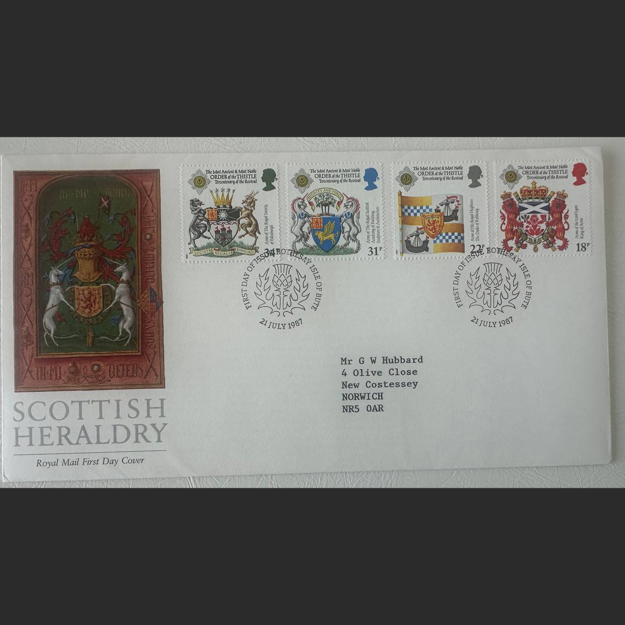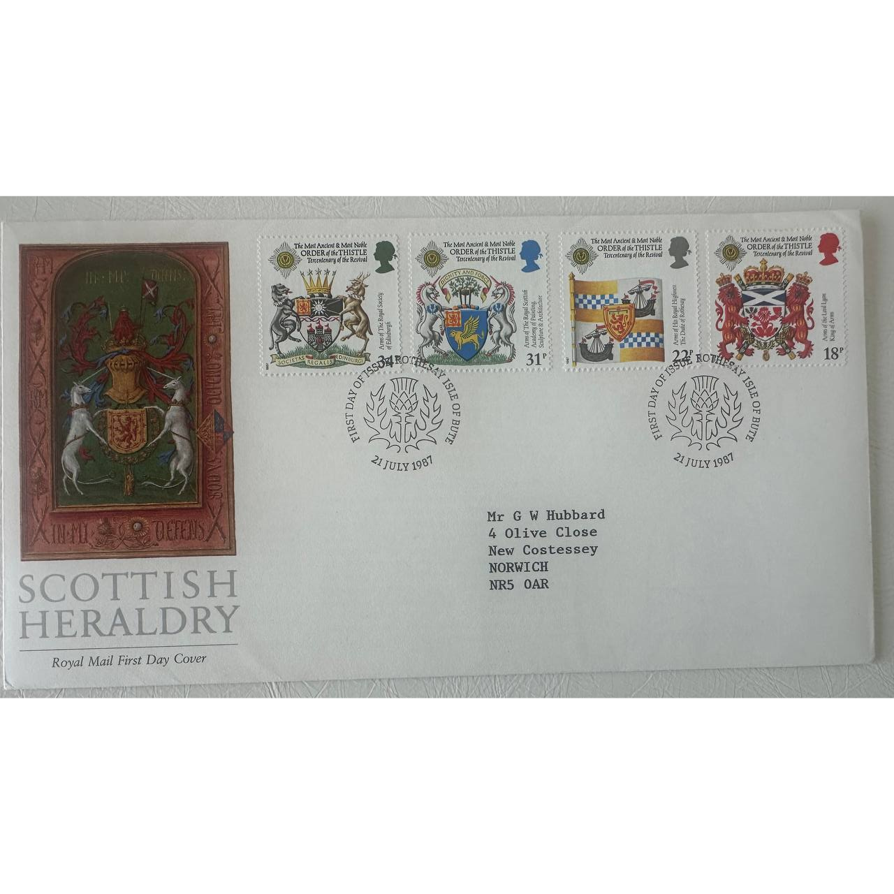 Description: Official Royal Mail First Day Cover featuring the Scottish Heraldry series. Includes four heraldic arms: Royal Society of Edinburgh, Royal Scottish Academy of Painting, Sculpture & Architecture, Duke of Rothesay, and Lord Lyon King of Arms. A fine collectible item for philatelists with interest in heraldry and British postal history.