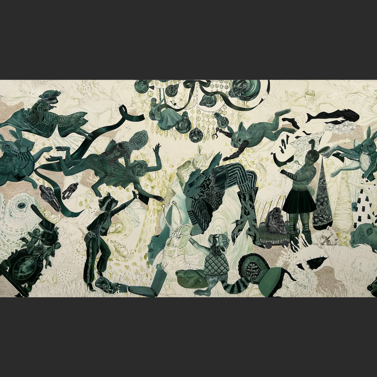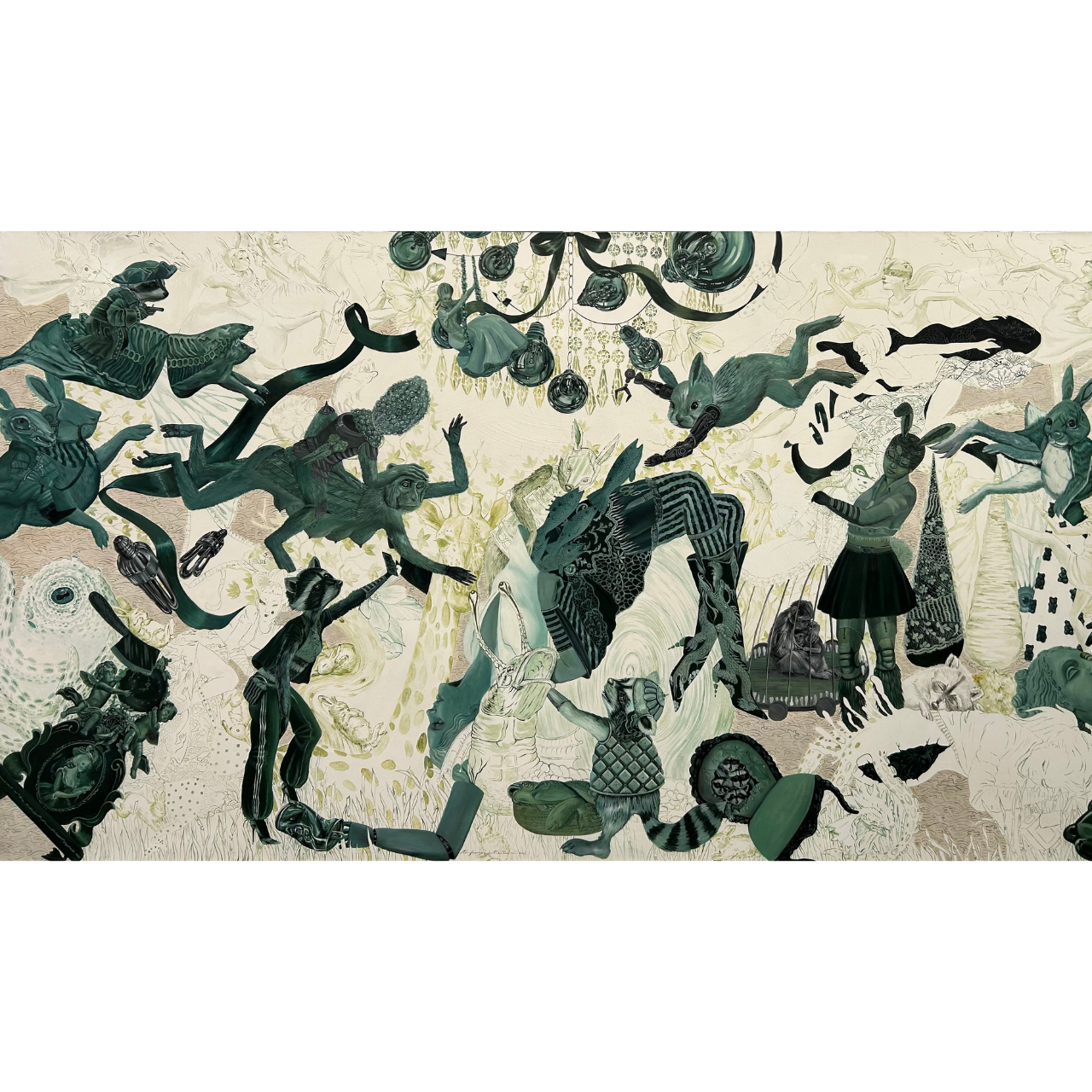Description: A lush swarm of emerald-toned creatures and characters animates the canvas in a fantastical chaos of movement and gaze. Moeini’s hybrid beings blend myth and whimsy, echoing miniature traditions while creating a surreal, self-contained dreamworld.