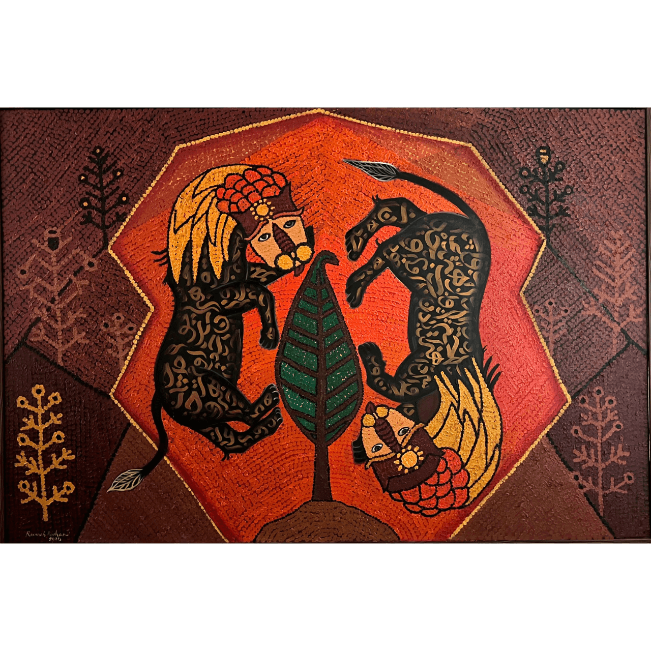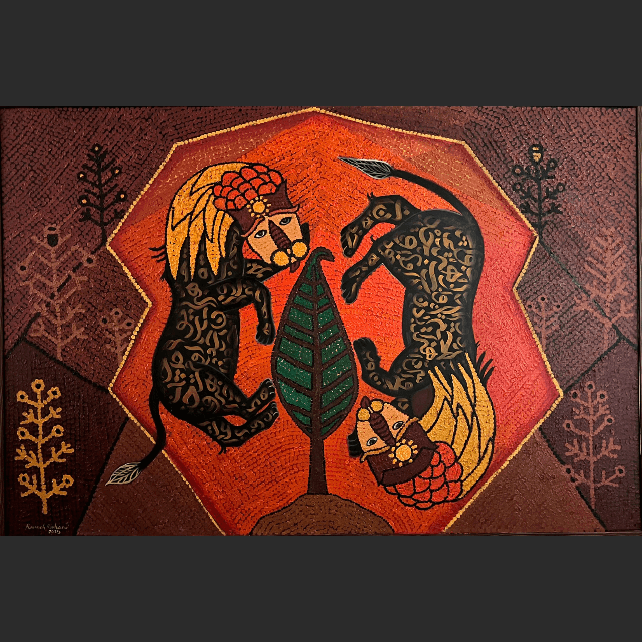 Guardians of the Cypress is a richly layered composition where mythology, calligraphy, and sacred geometry converge. Two lion-like figures, armoured with golden wings and patterned in stylized script, flank a central cypress tree, symbol of endurance and eternal life. Their mirrored stance and watchful faces lend the piece a ceremonial stillness, as though caught in an eternal vigil. Rouhani transforms the surface into a tapestry of meaning, balancing power and harmony within a glowing, earthy palette.