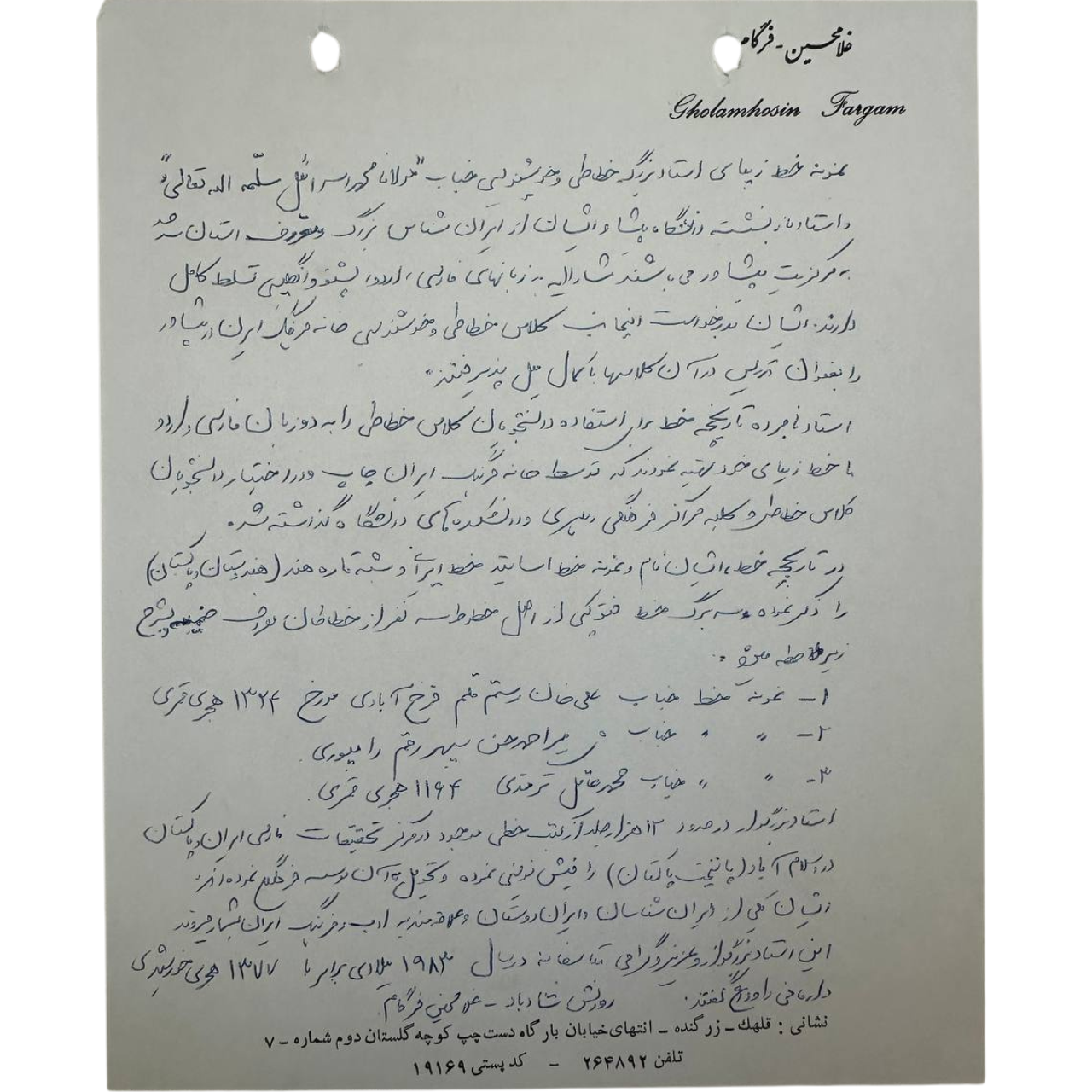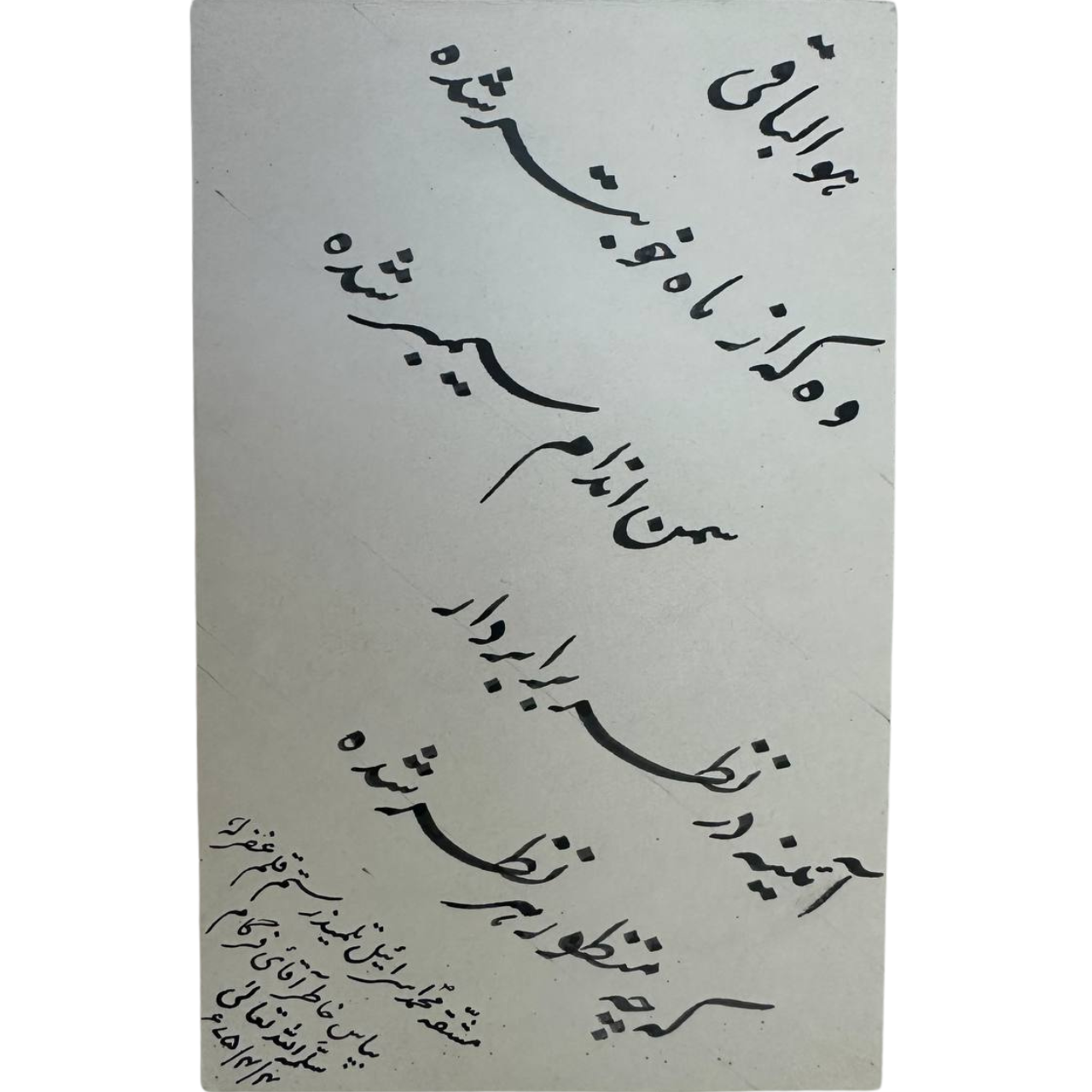 Additional Info: Original handwritten calligraphy, signed by the artist with full note of lineage and date. The paper shows natural aging consistent with vintage works. Rare and valuable for collectors of Persian calligraphy.