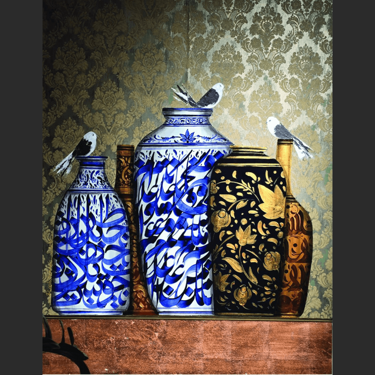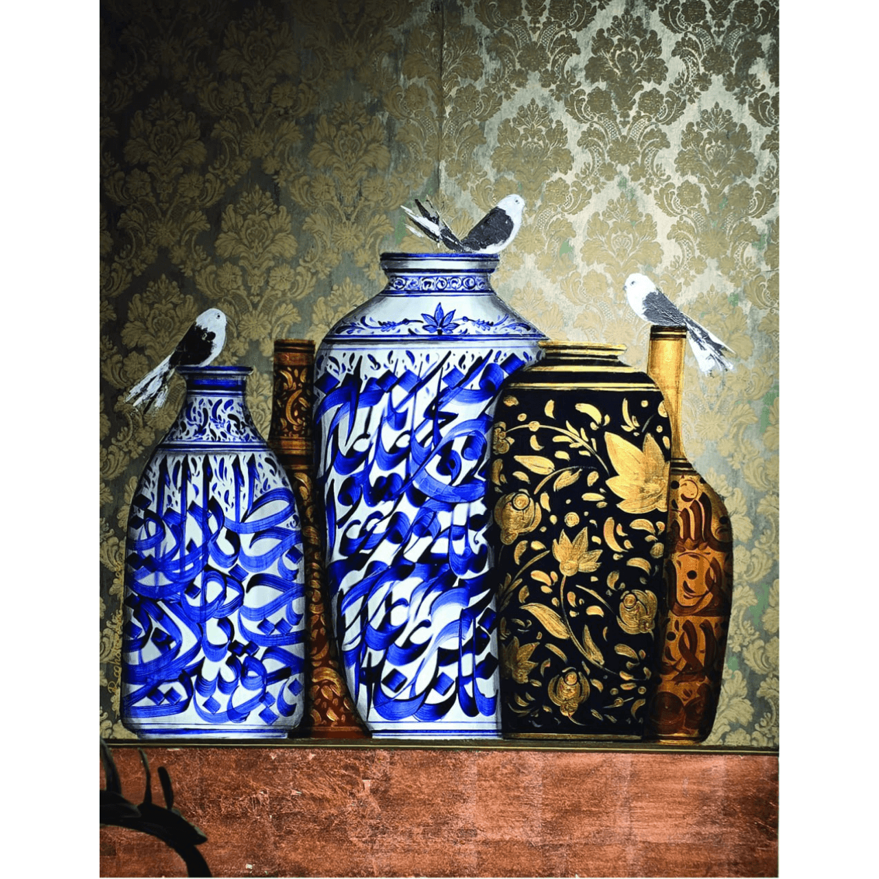 Description: "Hasan Abad" presents a vibrant and elegant still life deeply rooted in Persian artistry. A prominent arrangement of intricately decorated vessels dominates the foreground, two adorned with dynamic blue and white calligraphy, while another features opulent gold floral patterns against a dark ground. Perched delicately on these forms, white birds introduce a touch of life and symbolism. The rich, patterned background reminiscent of antique wallpaper adds depth and a sense of historical grandeur, creating a harmonious fusion of traditional motifs and a contemporary aesthetic.