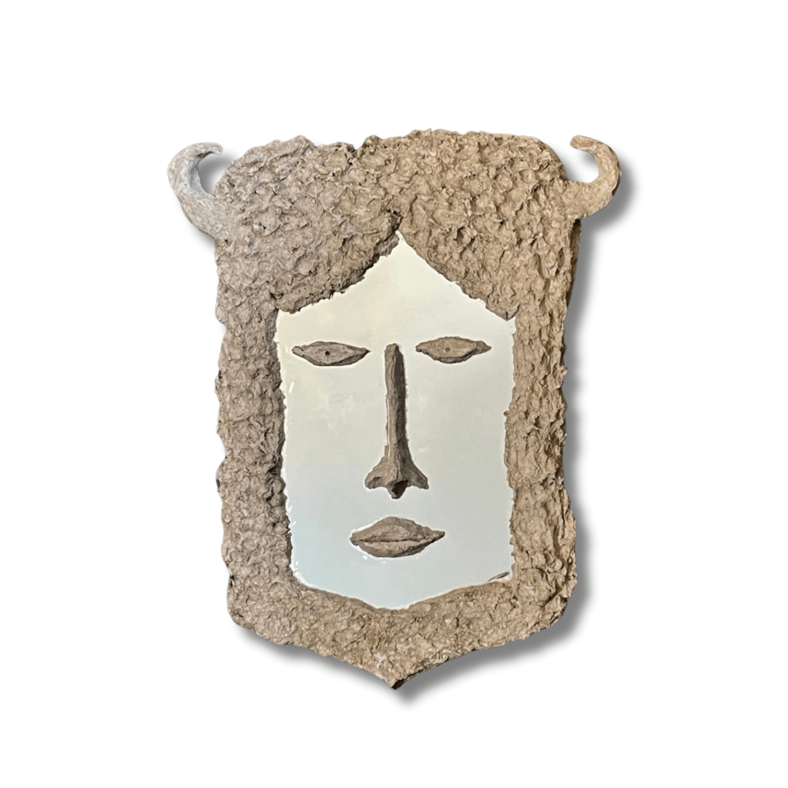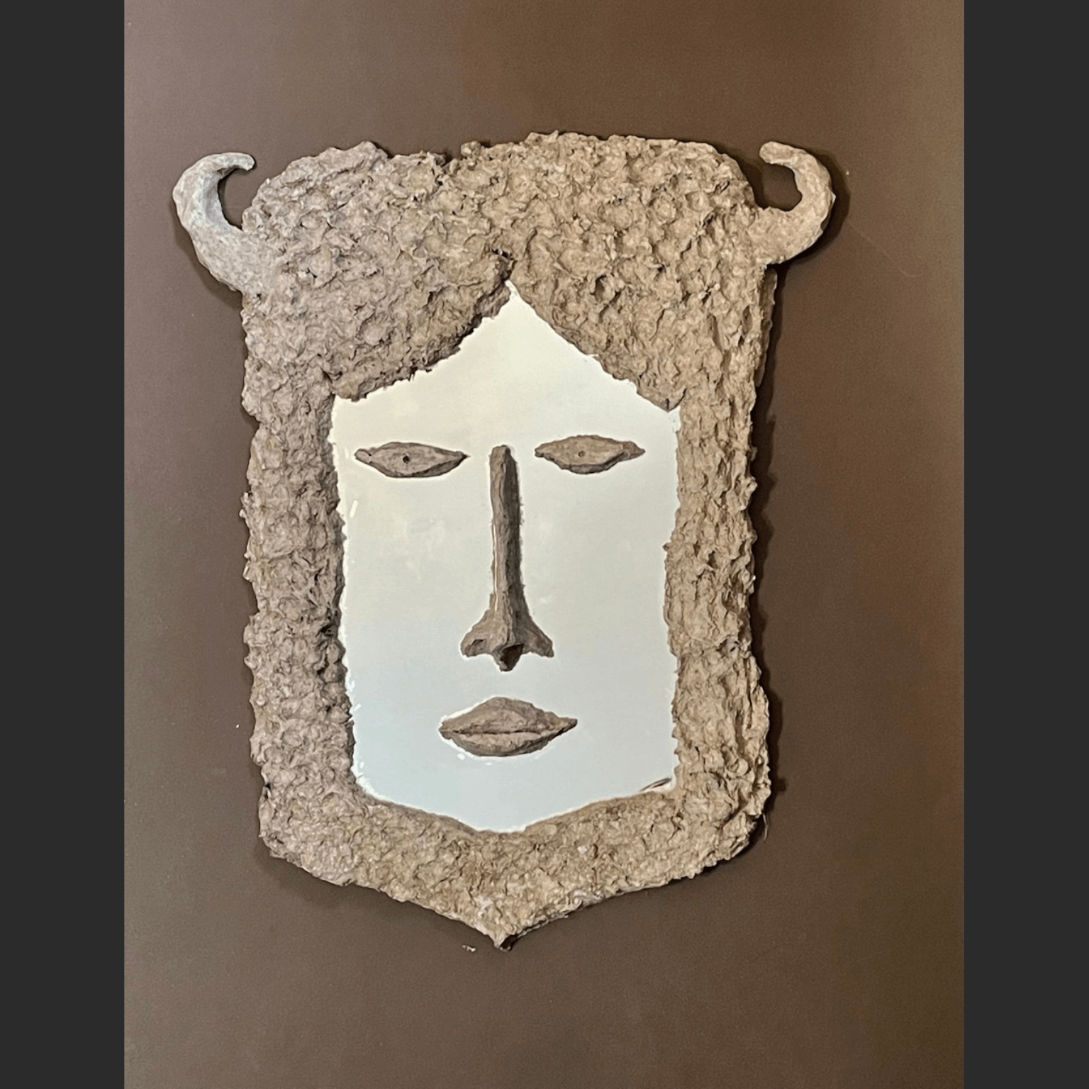 Description: A sculptural face framed by a wild, textured border and crowned with horn-like curves, Horned Reflection commands attention. The central plane—flat and reflective—contrasts with the dense papier-mâché, echoing the duality of self-perception and mythic identity. Mounted on the wall, the piece merges the decorative and the symbolic, inviting the viewer into a silent encounter with a gaze that is both theirs and not theirs.