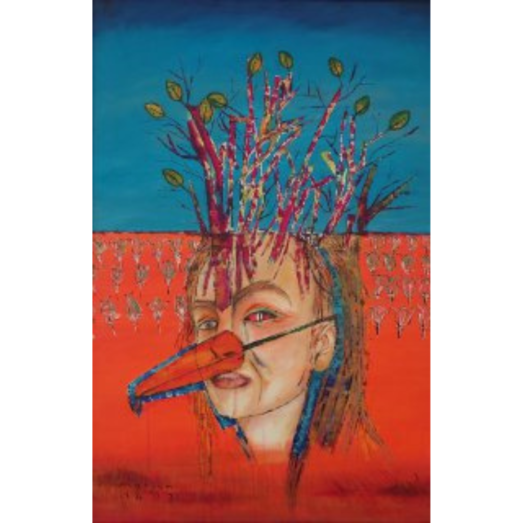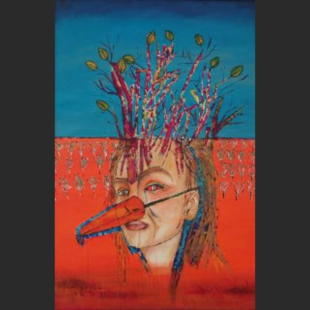 In I am Mother Nature, Andaroudi reclaims the female figure as a vessel of renewal and rebellion. The central portrait, with branches sprouting from the head and a beak-like mask extending from the face, merges woman and nature into one symbolic entity, half-rooted, half-awakened. The vivid contrast of turquoise and crimson amplifies both vitality and tension, portraying an intimate dialogue between instinct and intellect. Through this surreal composition, the artist challenges the boundaries imposed on the feminine body and spirit, suggesting resilience within vulnerability.