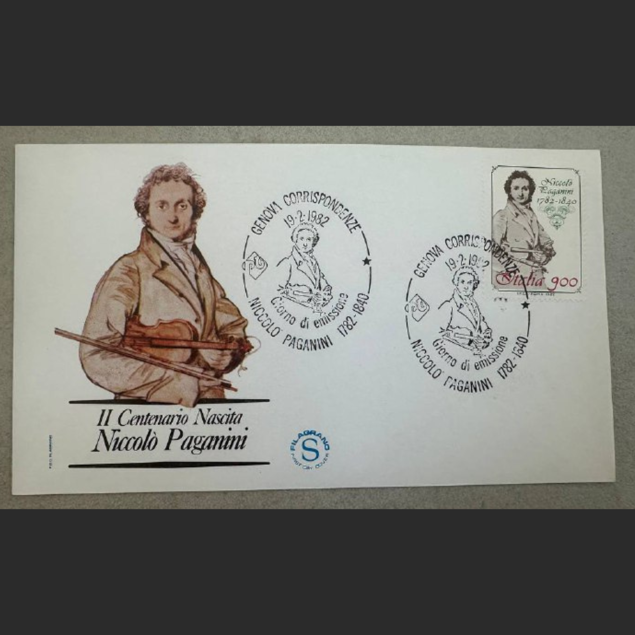 Description: Commemorative Italian First Day Cover issued in 1982 to celebrate the 200th anniversary of the birth of Niccolò Paganini (1782–1840), the legendary violin virtuoso and composer.