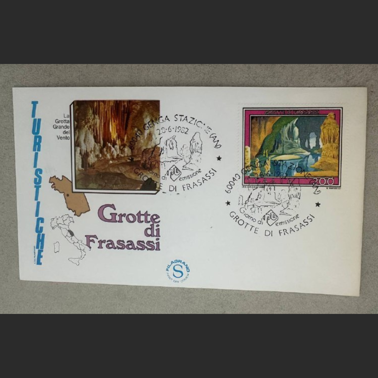 Description: Italian First Day Cover commemorating the famous Frasassi Caves (Grotte di Frasassi), located in the Marche region. Features a 200 lire commemorative stamp depicting the cave formations, with a matching first-day cancellation. Illustrated cachet shows the striking stalactites and stalagmites inside the caves.