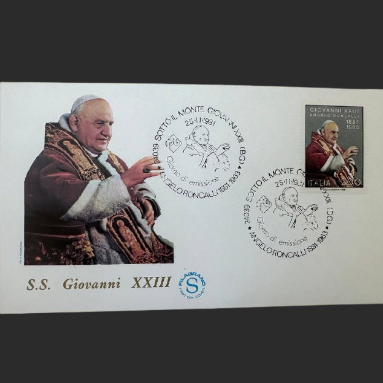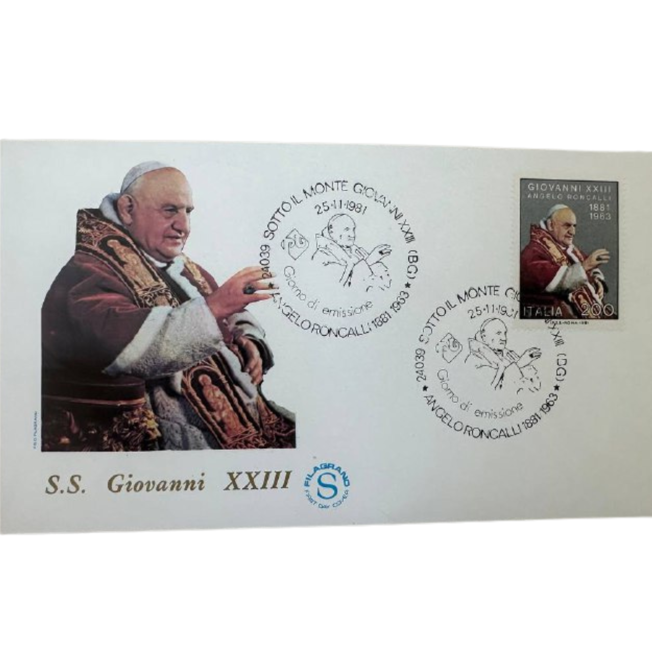 Description: Commemorative Italian First Day Cover issued in 1981 honoring Pope John XXIII (Angelo Giuseppe Roncalli, 1881–1963), who was canonized for his pastoral spirit and remembered for convening the Second Vatican Council.