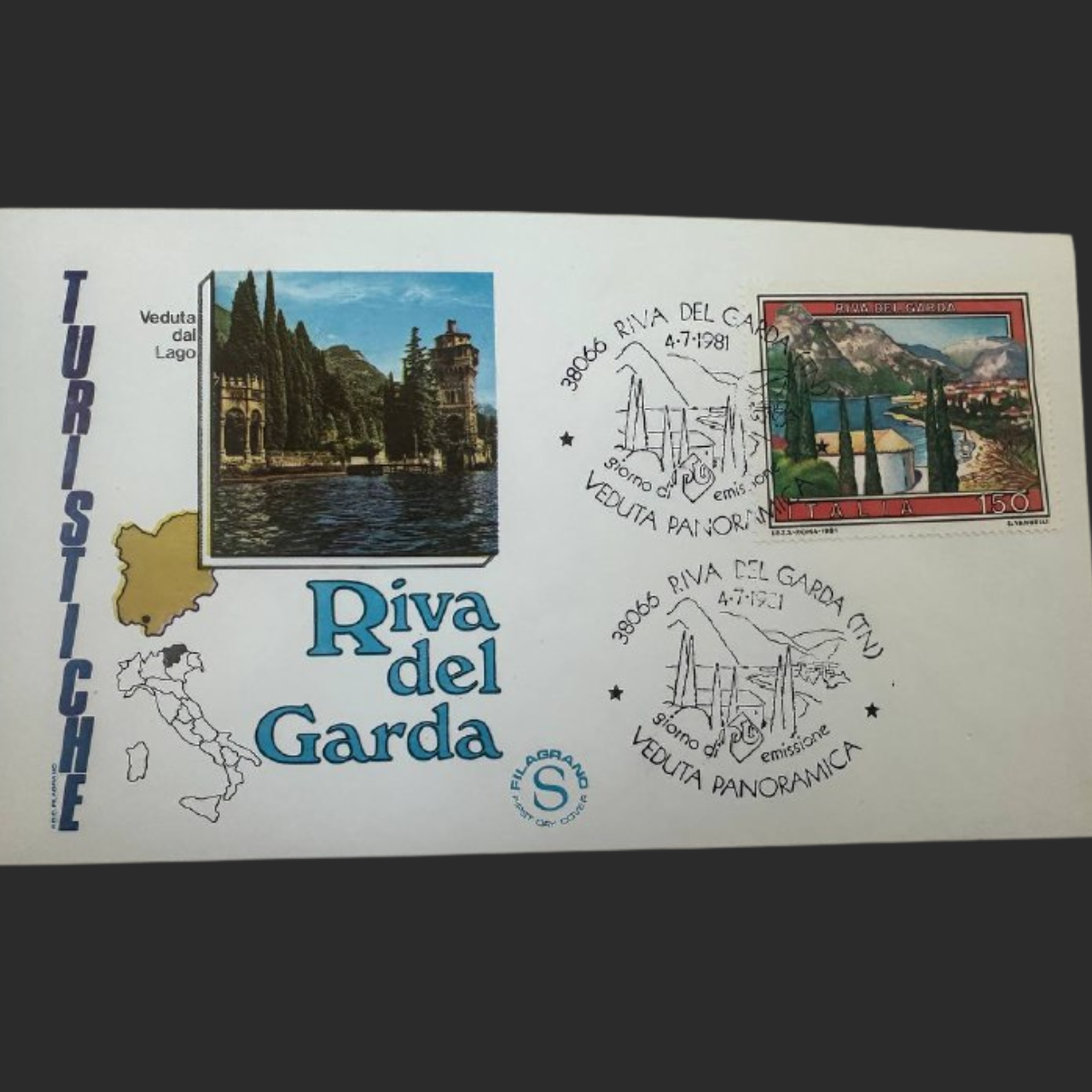 Description: Commemorative Italian First Day Cover issued in 1981 featuring the panoramic view of Riva del Garda, a historic town located on Lake Garda. The cachet shows a vivid image of the lakeside architecture, while the special 150 Lire stamp illustrates a scenic panoramic landscape. Official Riva del Garda cancellation dated 4 July 1981 confirms its authenticity as a First Day Cover.