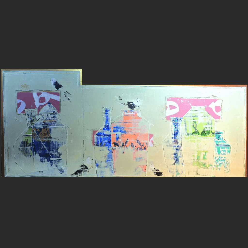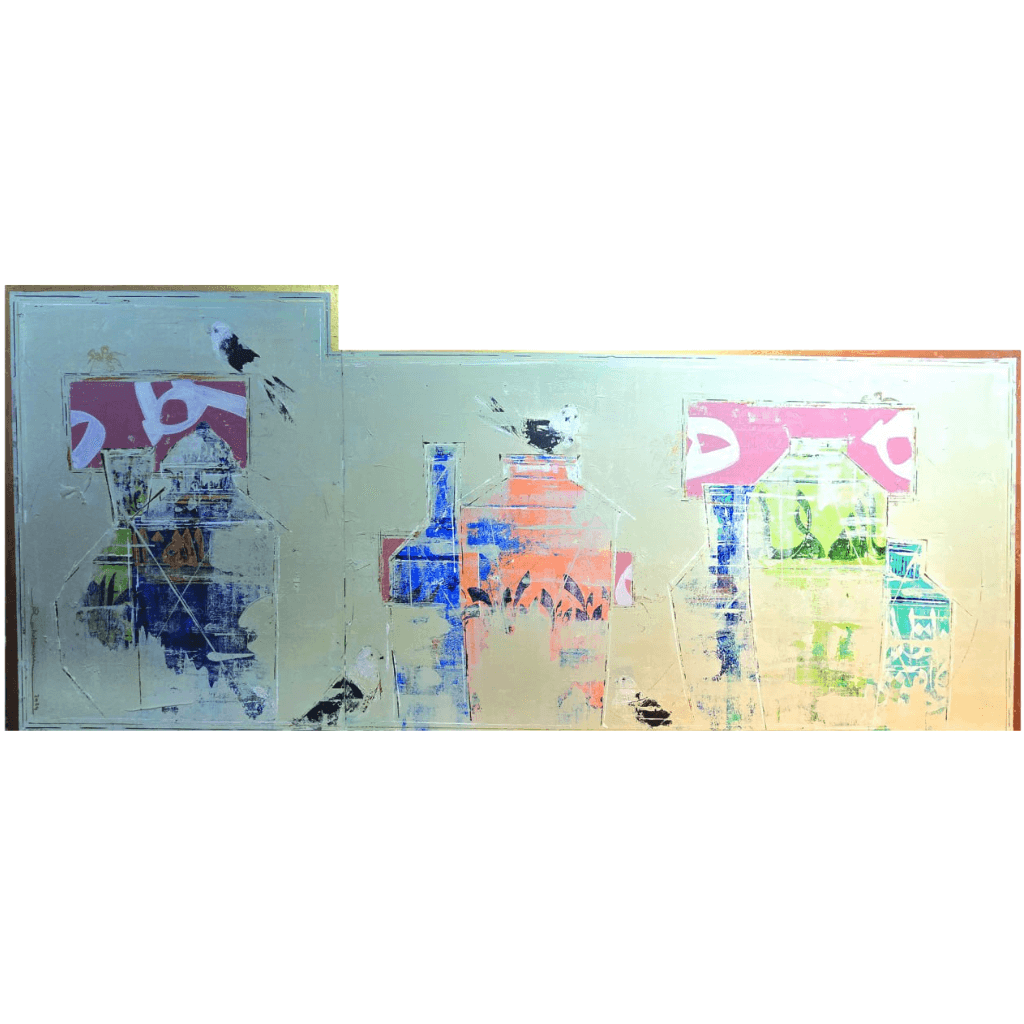 Description: Kamranieh is an abstract work where a metallic, reflective background evokes shimmering layers of memory. Ghostly outlines of architecture and vessels emerge through muted colors and textured strokes, suggesting hidden narratives. Geometric shapes and fragmented forms heighten the sense of depth, creating an ethereal, timeless landscape.
