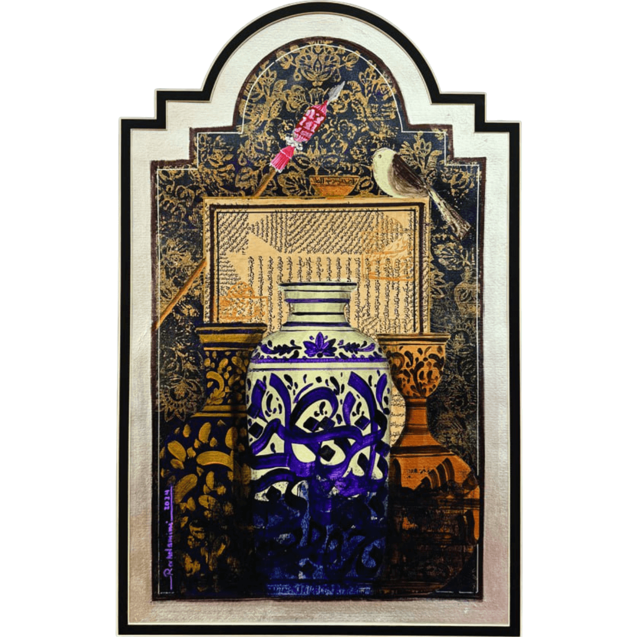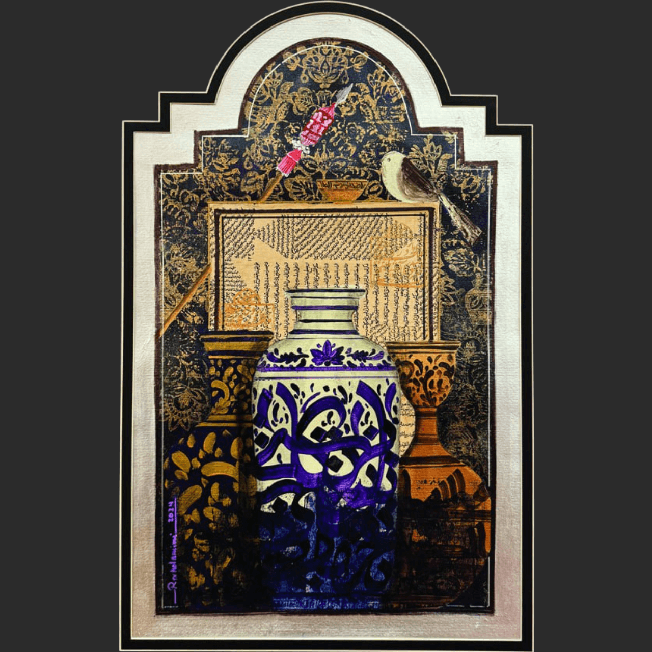 Description: "Karim Khan" is a richly layered and evocative piece, presented within a distinctive arched frame that suggests an architectural niche or portal. A central vessel, adorned with striking purple calligraphy, anchors the composition, flanked by other intricately patterned forms. Above, a segment of classical text and a delicate bird motif allude to historical narratives and poetic traditions. The use of a metallic, subtly patterned background, combined with a muted palette, creates a deep sense of heritage and quiet reverence.