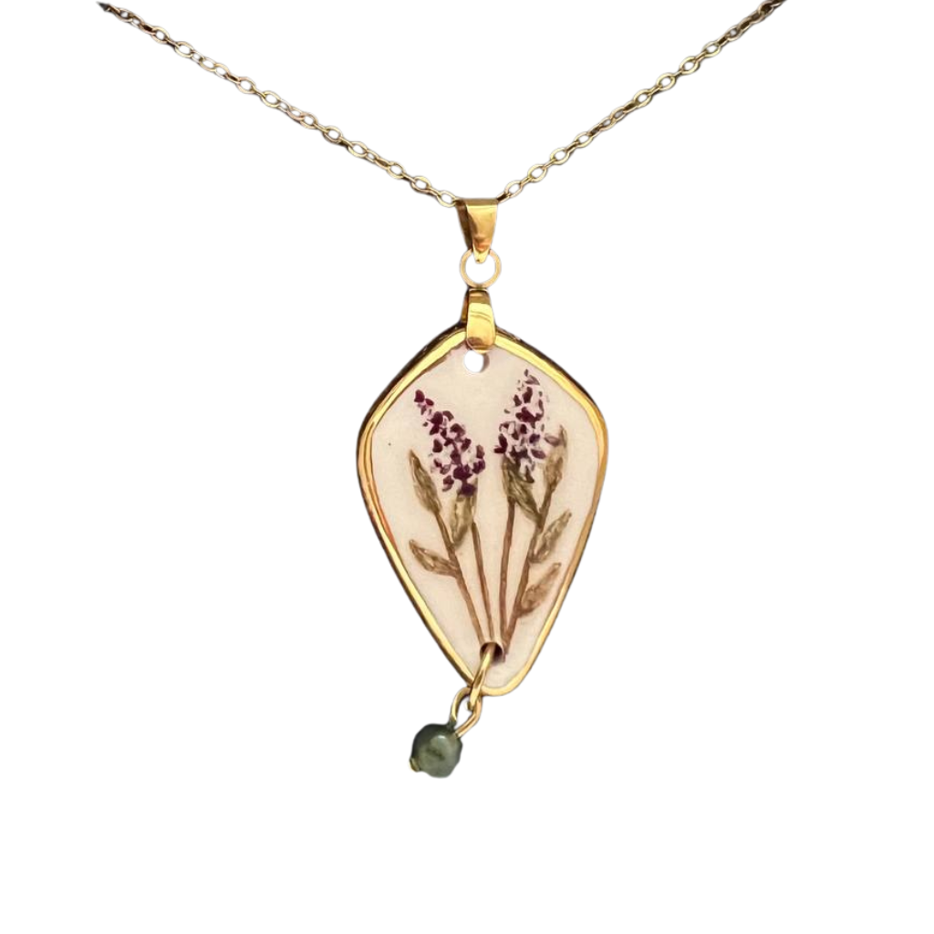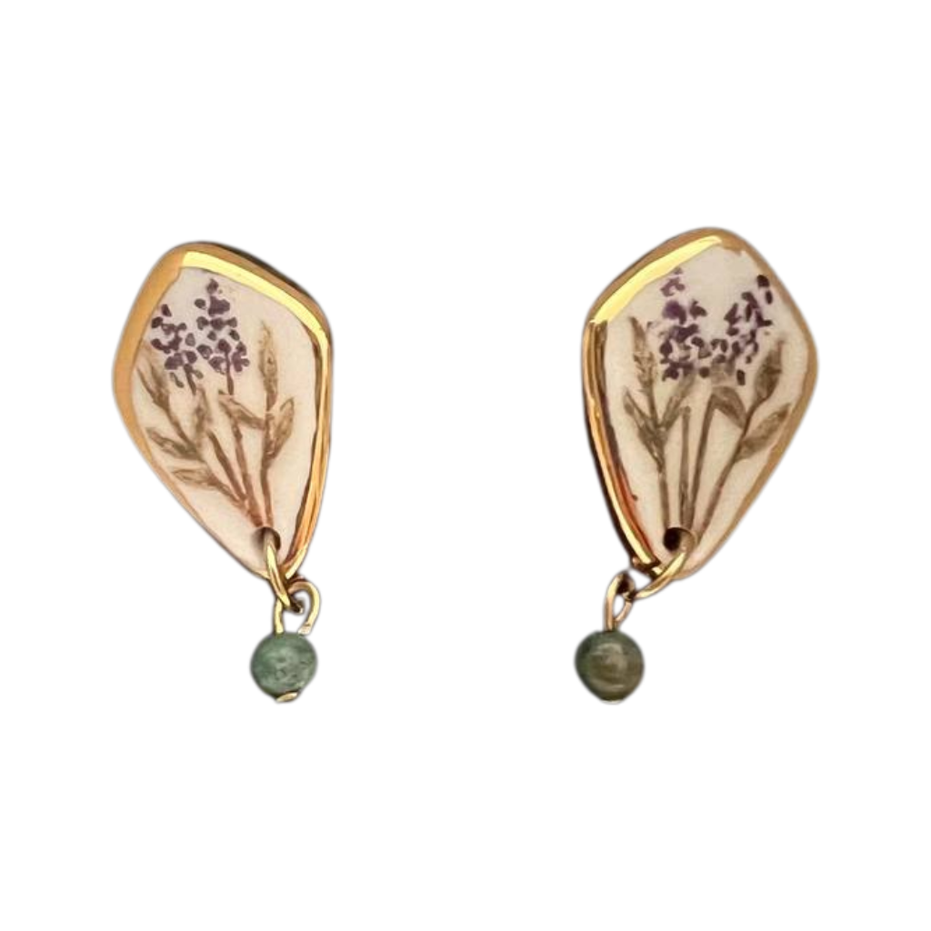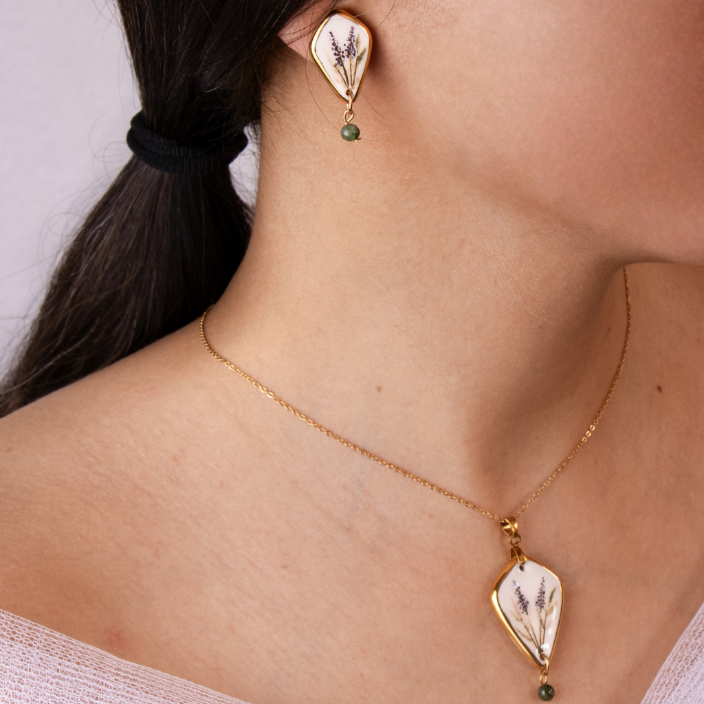 Description: The Lavender Petal Set captures the quiet elegance of nature with soft purple floral details delicately painted on cream enamel. The pieces are framed in a warm gold-tone setting and finished with green bead accents that add a subtle touch of movement. Ideal for both daily elegance and special occasions, this set embodies the charm of artisanal craftsmanship.