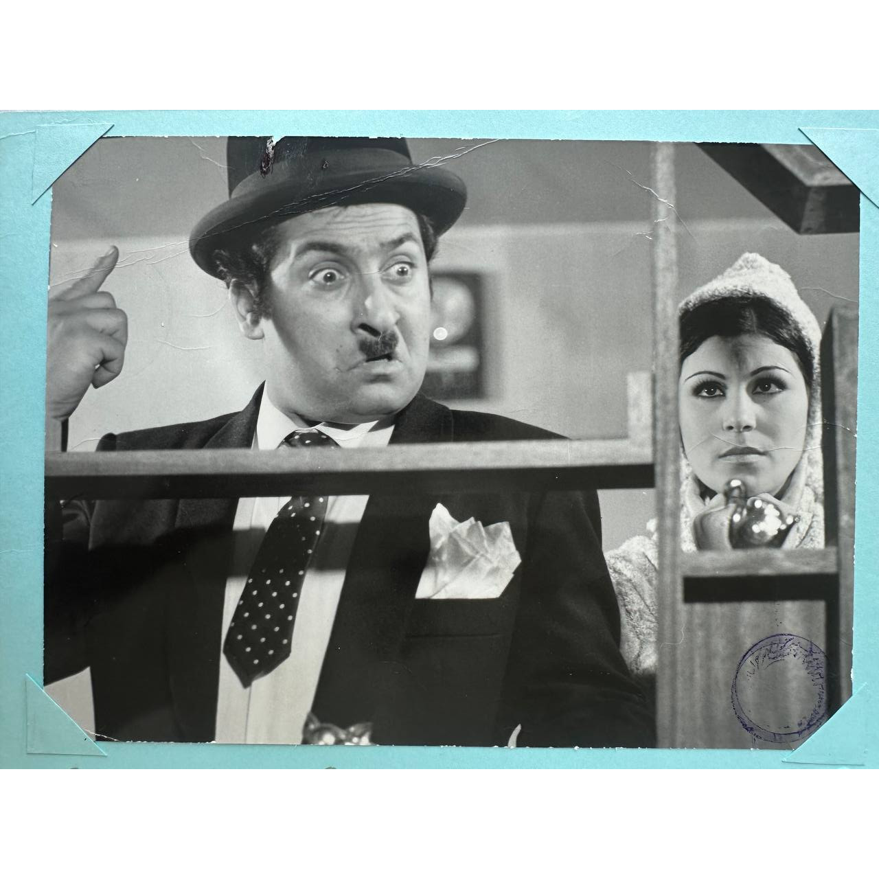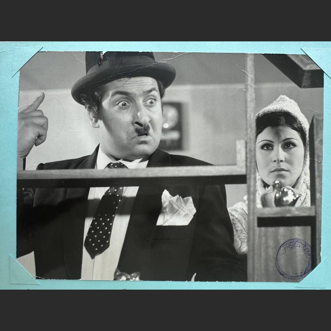 Description: An original lobby card from the Iranian comedy Agha Reza-ye Gol (Mr. Reza Gol, 1974), directed by Mehdi Raees-Firooz and written by Ahmad Najibzadeh. This still captures actor Ali Miri in one of the film’s humorous sequences, a fine example of the slapstick style that defined much of Film Farsi’s comedic output in the 1970s.