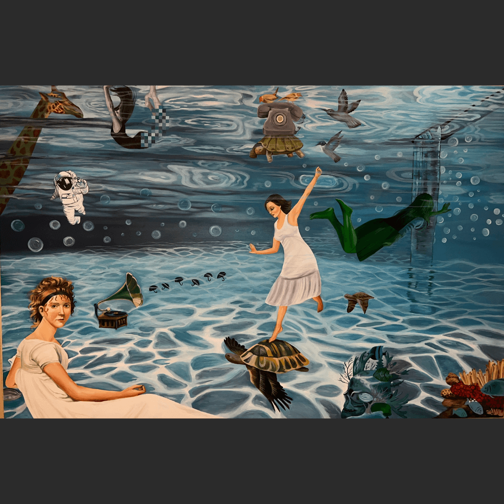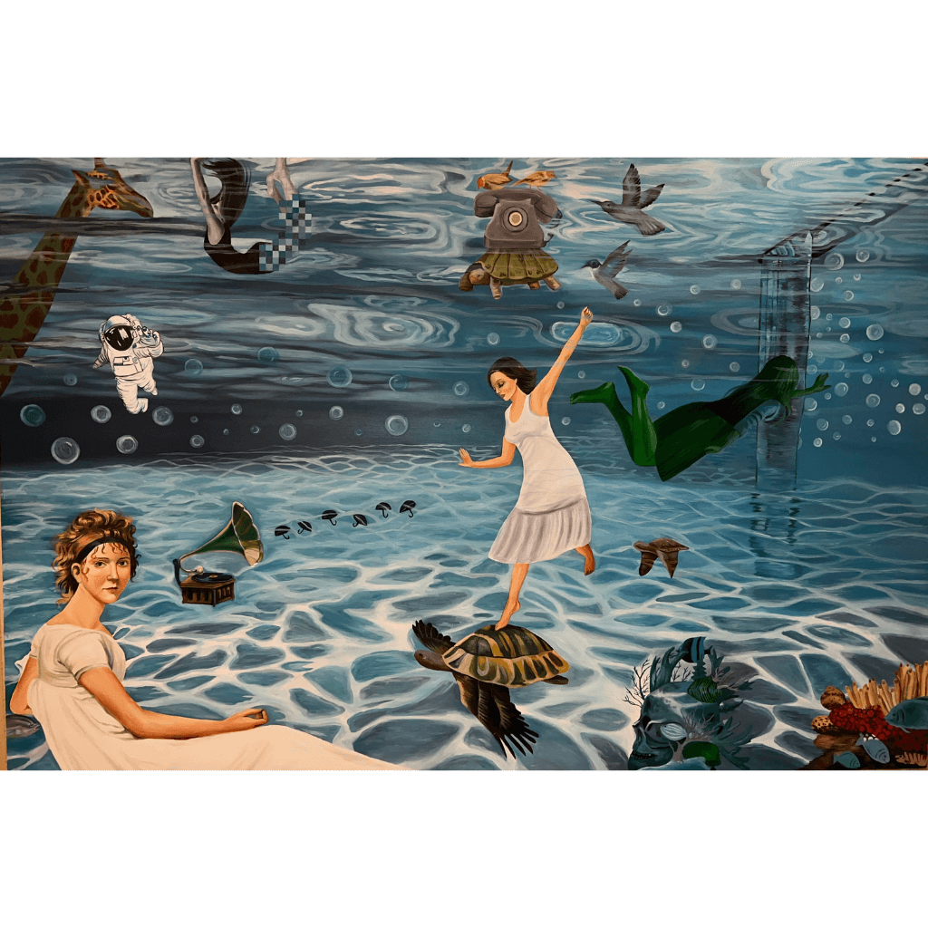 Description: Madam Under the Ocean immerses the viewer in a surreal aquatic dreamscape where reality drifts into fantasy. Figures and objects float weightlessly: an elegant woman balancing atop a turtle with wings, a vintage gramophone releasing musical notes into the water, and an astronaut adrift among bubbles. Sea creatures, mythical shapes, and fragments of everyday life intertwine beneath shimmering waves, evoking a sense of wonder, nostalgia, and playful absurdity. The luminous blues and fluid forms draw the eye into a world where time feels suspended.