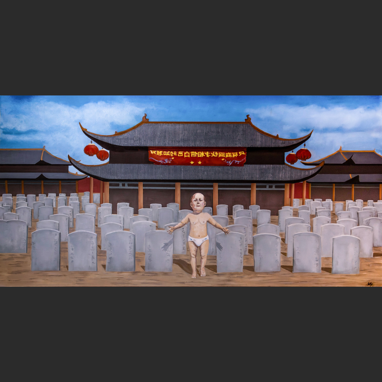 Description: In this haunting composition, a toddler-like figure stands alone among rows of gravestones in a traditional Chinese temple courtyard. Above him, a bold red banner echoes state propaganda, while the surrounding tombs suggest a silent memorial to forgotten lives. The work interrogates themes of historical erasure, authoritarian legacy, and the loneliness of power cloaked in innocence.