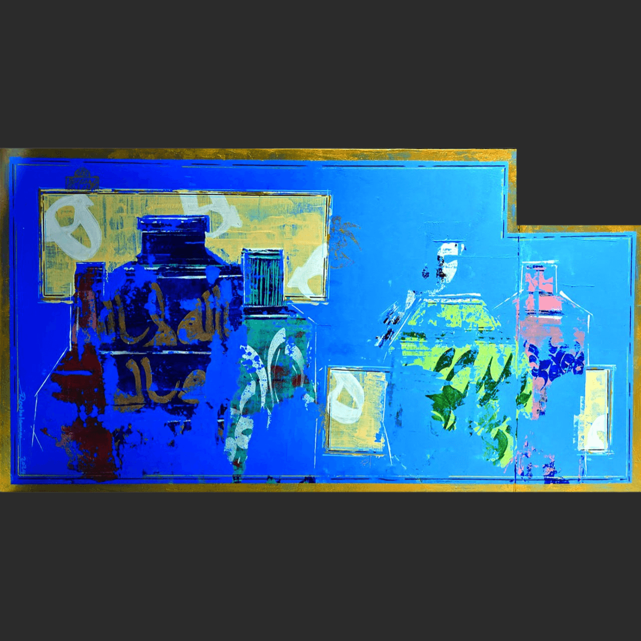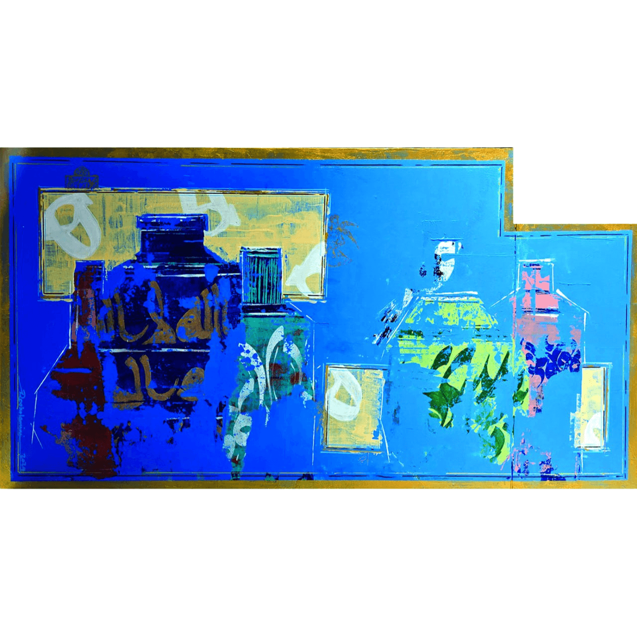 Description: "Mirdamad" is a dynamic and vibrant abstract work characterized by its striking blue dominant palette. The composition features fragmented forms, reminiscent of architectural elements or vessels, emerging from and receding into the energetic background. Touches of gold, rust red, and teal, along with subtle calligraphic strokes, are integrated through mixed media, creating a rich textural surface. The interplay of bold colors and layered forms evokes a sense of historical narrative or urban landscape viewed through a contemporary, expressive lens.
