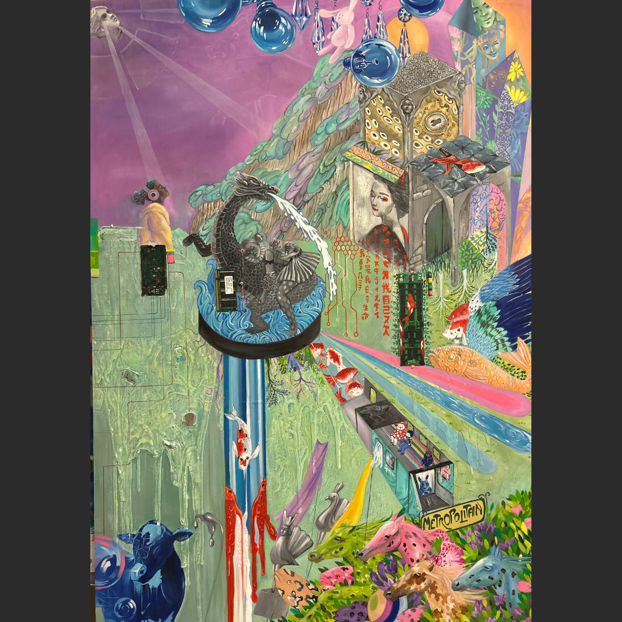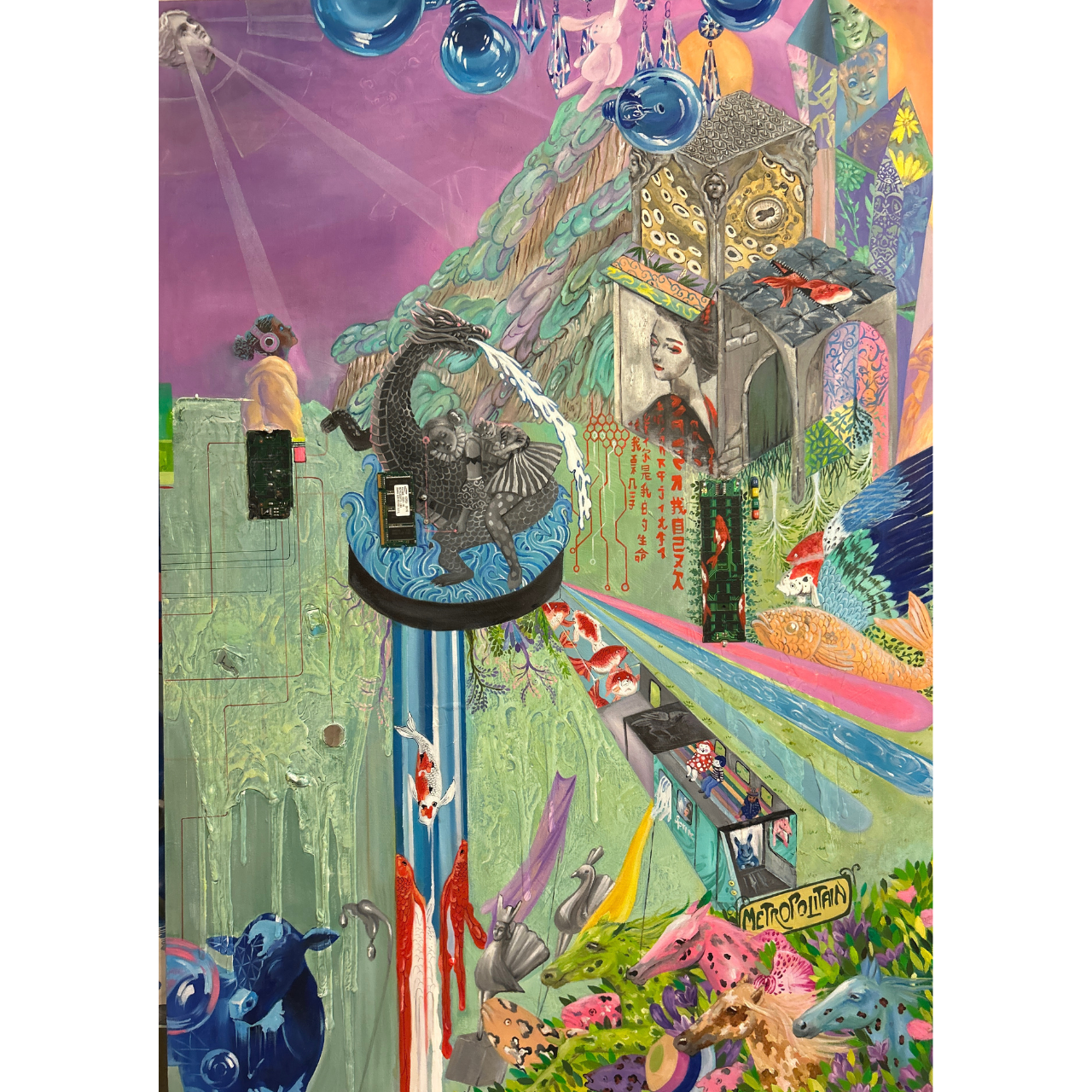 Nuclear River is a visually rich, dreamlike tapestry where symbolism flows as freely as the rivers within it. Nafiseh Moeini weaves together koi fish, mythological creatures, architectural fragments, and circuits to explore the tension between natural life and digital or radioactive intrusion. Drawing inspiration from Eastern miniature painting, she merges sacred motifs with pop-surrealist elements, creating a world where spiritual, ecological, and technological dimensions coexist in radiant conflict. The result is a fantastical ecosystem that invites viewers to decode its layered narrative.