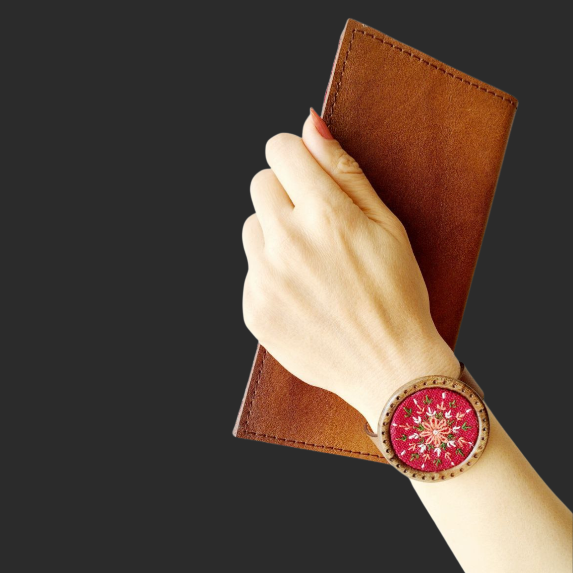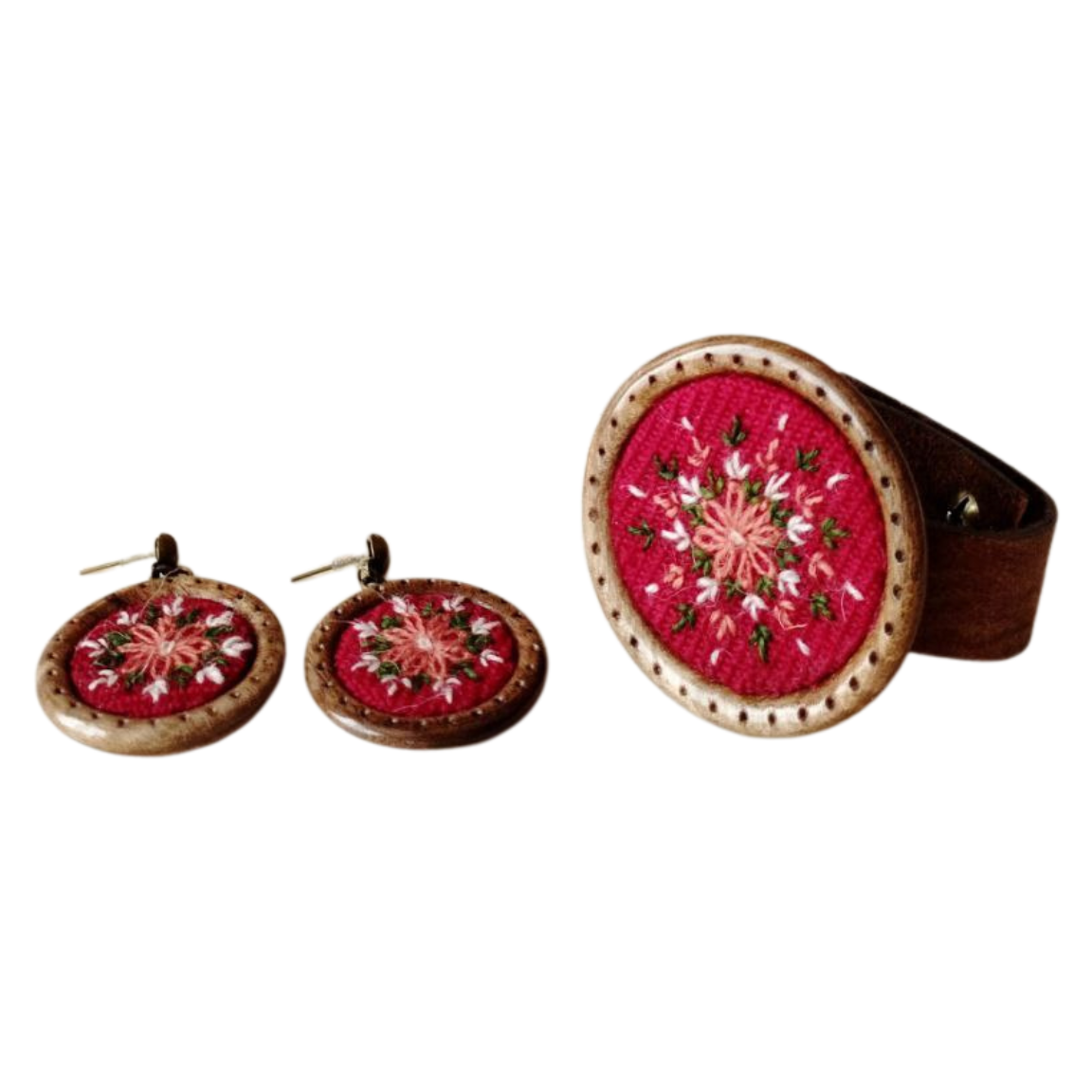 Overview: The Pateh Nordokht set features round floral embroidery in vibrant pink, framed with rustic wooden edges and leather details. This handcrafted design includes earrings and a bracelet, blending Persian heritage with a modern look.