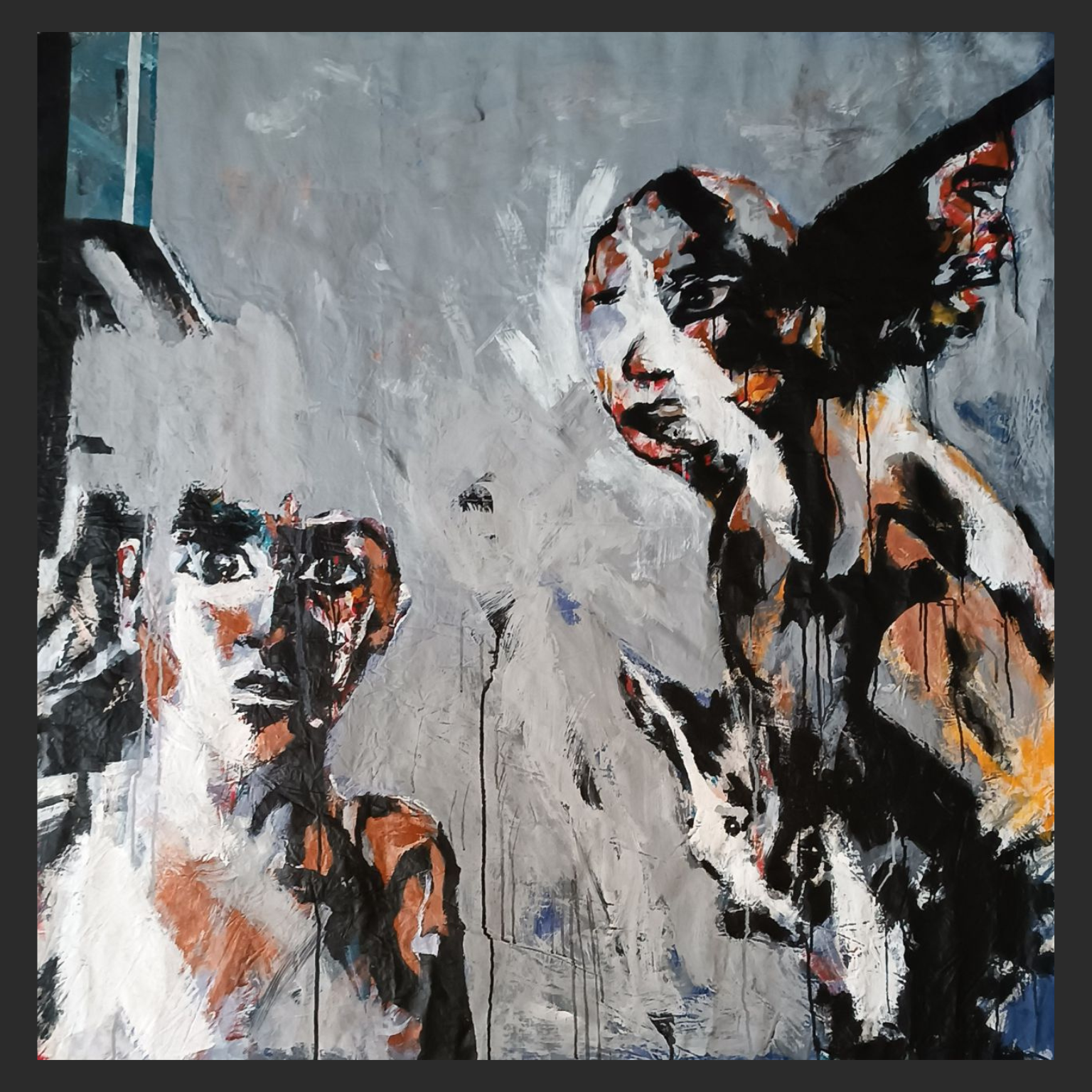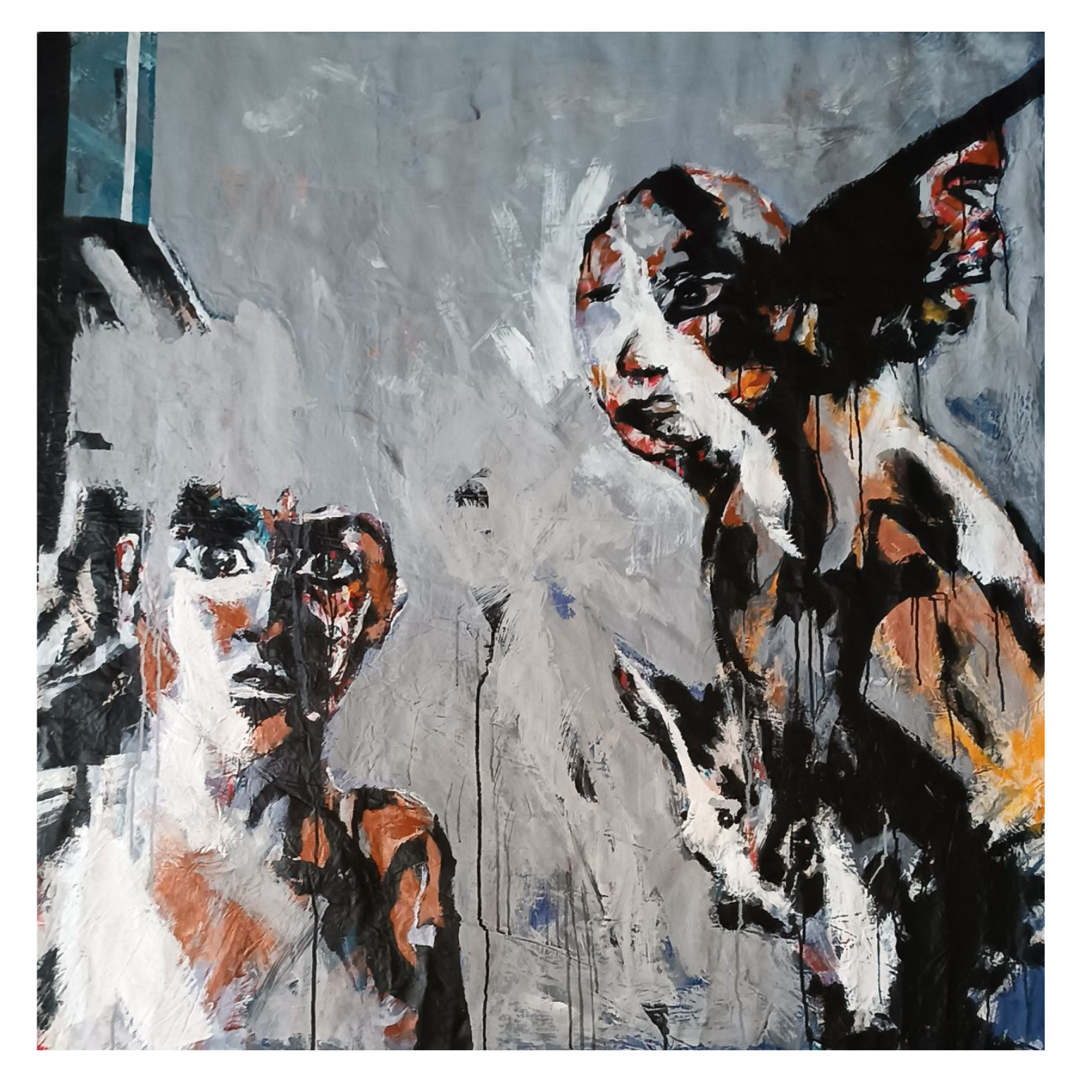 Description: This painting evokes a distant period, where space is dominated by shades of grey and dusty light. Within the portraits, hints of brown and red emerge — some more vibrant than others — yet the bright whites shine through and balance the weight. It is a meditation on stillness and memory, suspended in a muted emotional terrain.