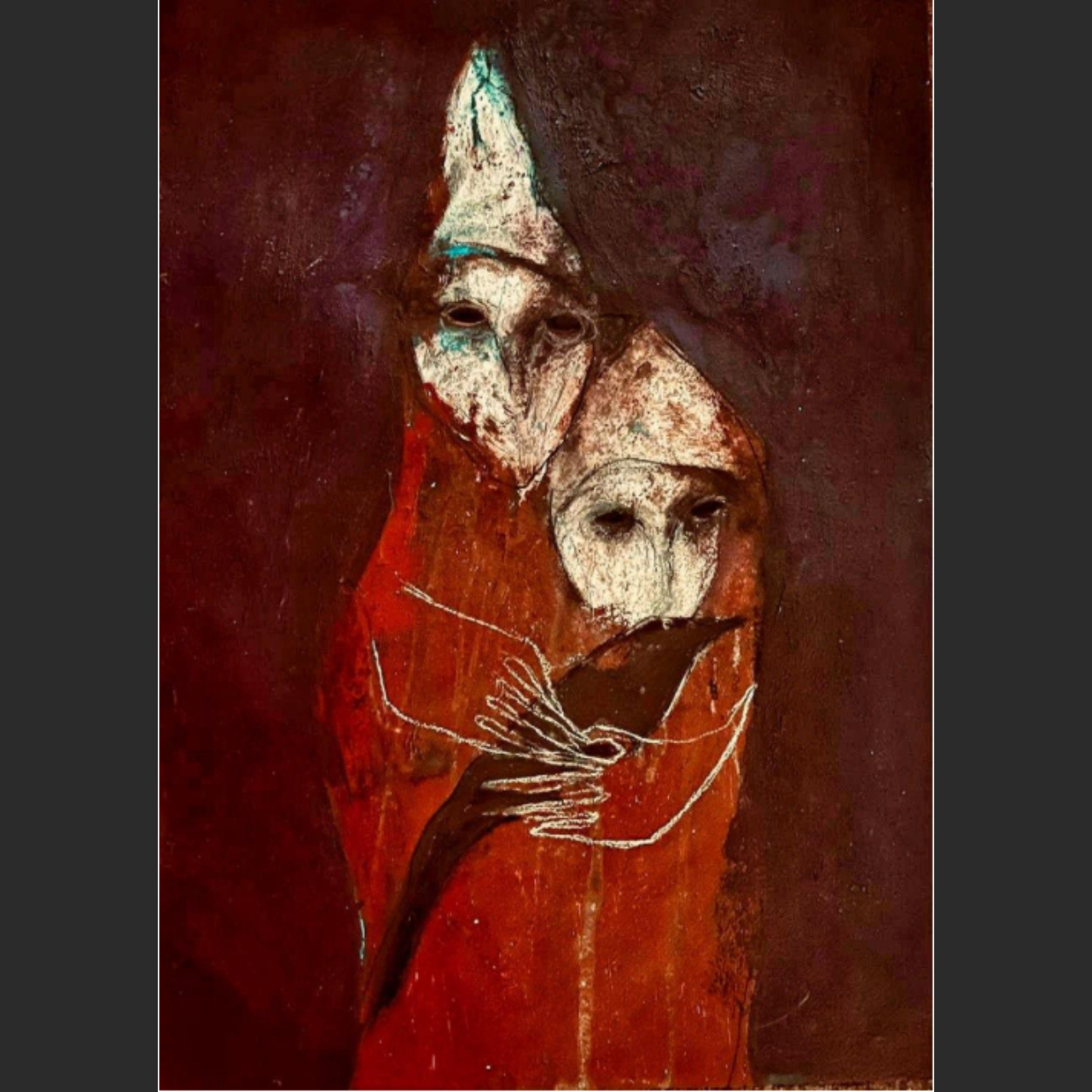 Description: A smaller, intimate piece that reflects on the fragility of human emotions and the masks we wear. The painting features a blend of vibrant and muted colors, creating a sense of depth and vulnerability.