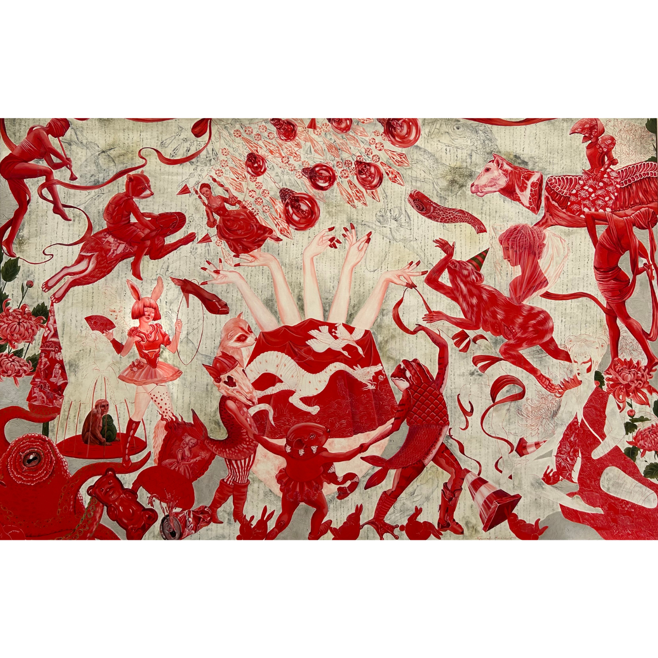 Description: In a vivid explosion of red, fantastical hybrid figures dance, leap, and gesture around a central table crowned with floating hands. Drawing from Persian miniature, surrealist play, and narrative symbolism, this piece conjures a dream realm of ritual, control, and childhood memory.