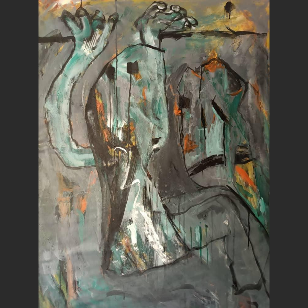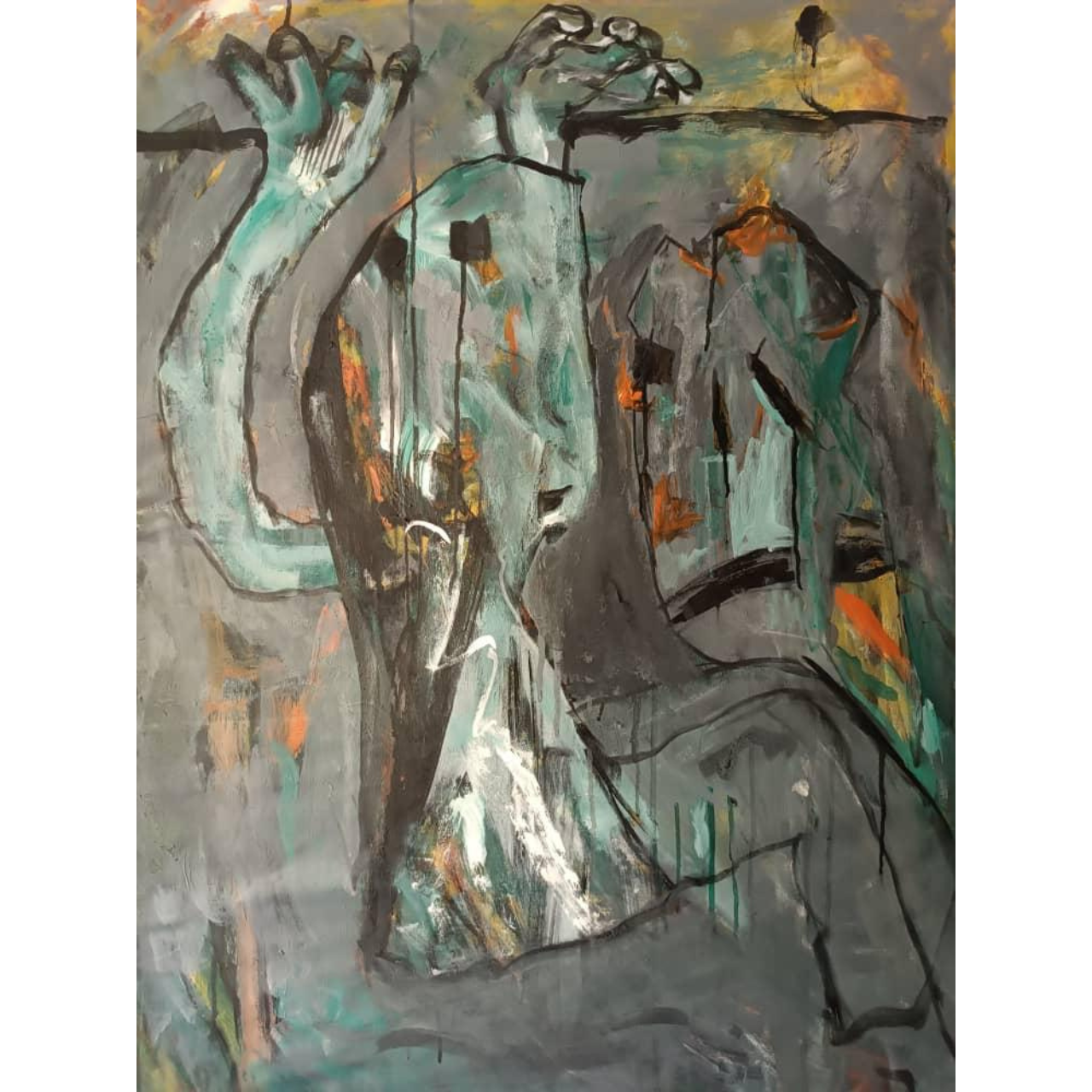 Release pulses with dynamic movement and emotional intensity. Distorted human forms reach upward in a tangled, abstracted composition that evokes both struggle and transcendence. The heavy use of greenish tones, interspersed with fiery oranges and stark blacks, creates a powerful tension between confinement and escape. Ziba Vishteh’s brushwork is visceral and unrestrained, making this piece a raw expression of the yearning to break free from unseen boundaries both internal and external.
