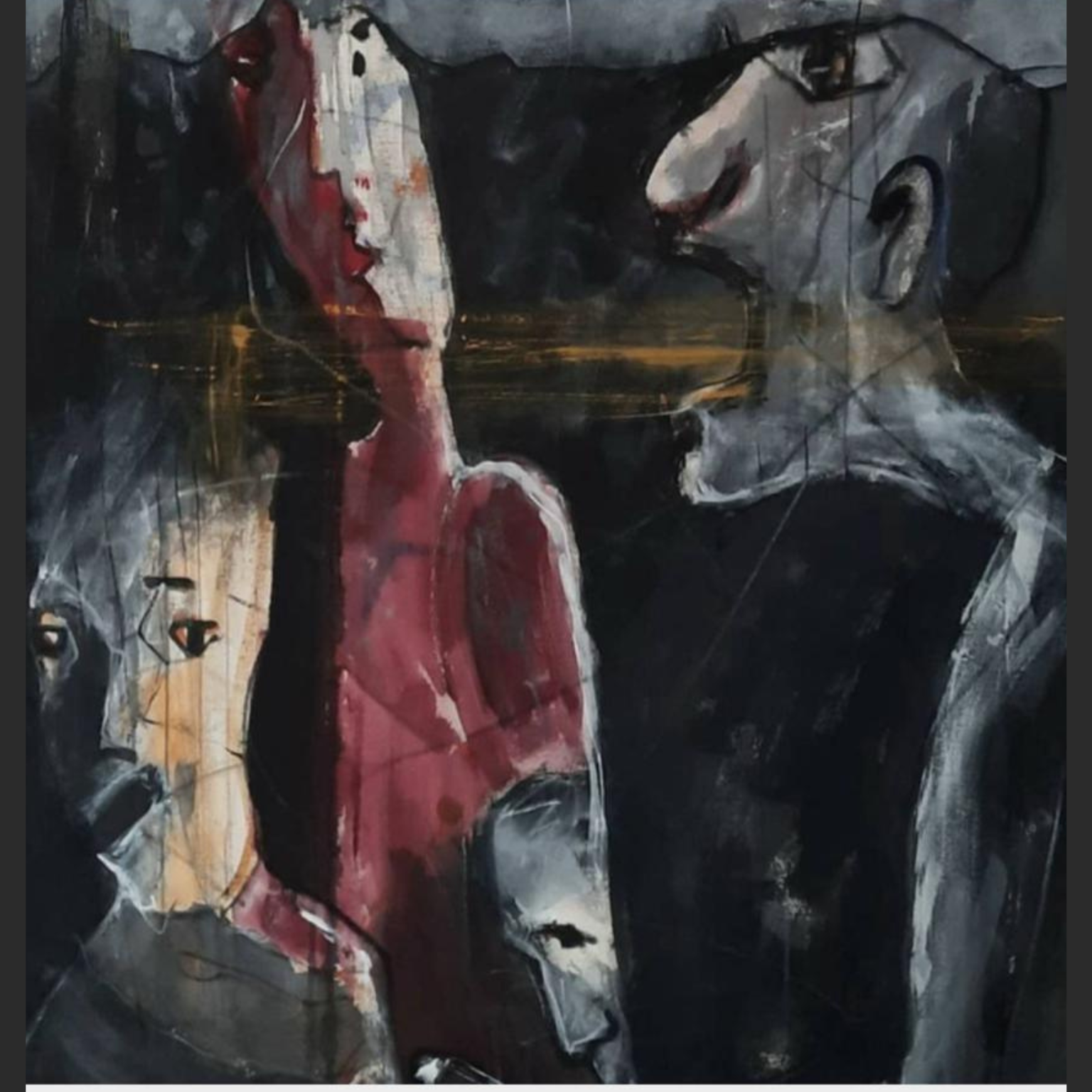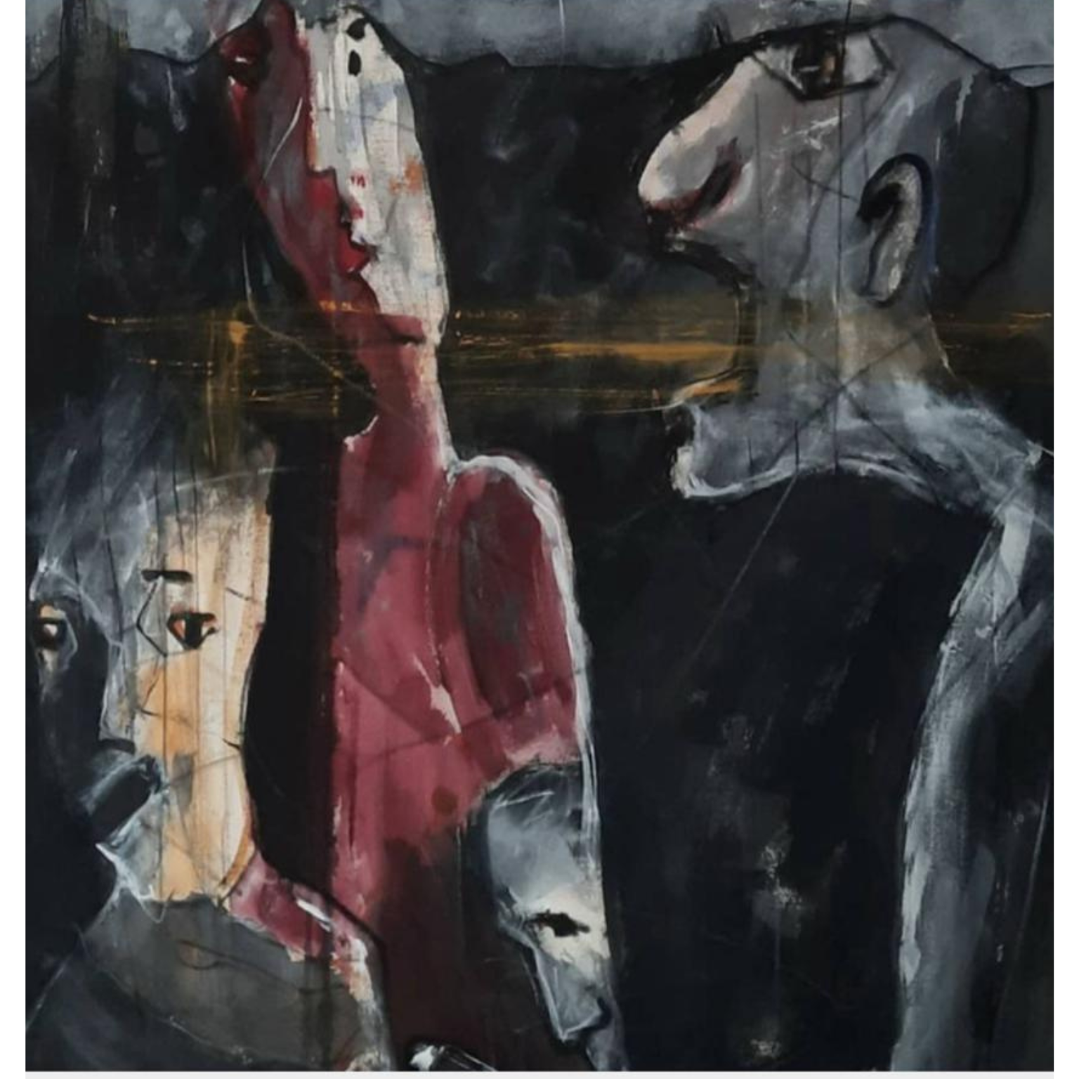 Description: Using a limited palette, this painting conjures a dark and haunting emotional space. Elongated figures emerge in somber tones, locked in a silent, almost surreal moment of intensity. The scene evokes an inner scream, one that reverberates through shadow and stillness.