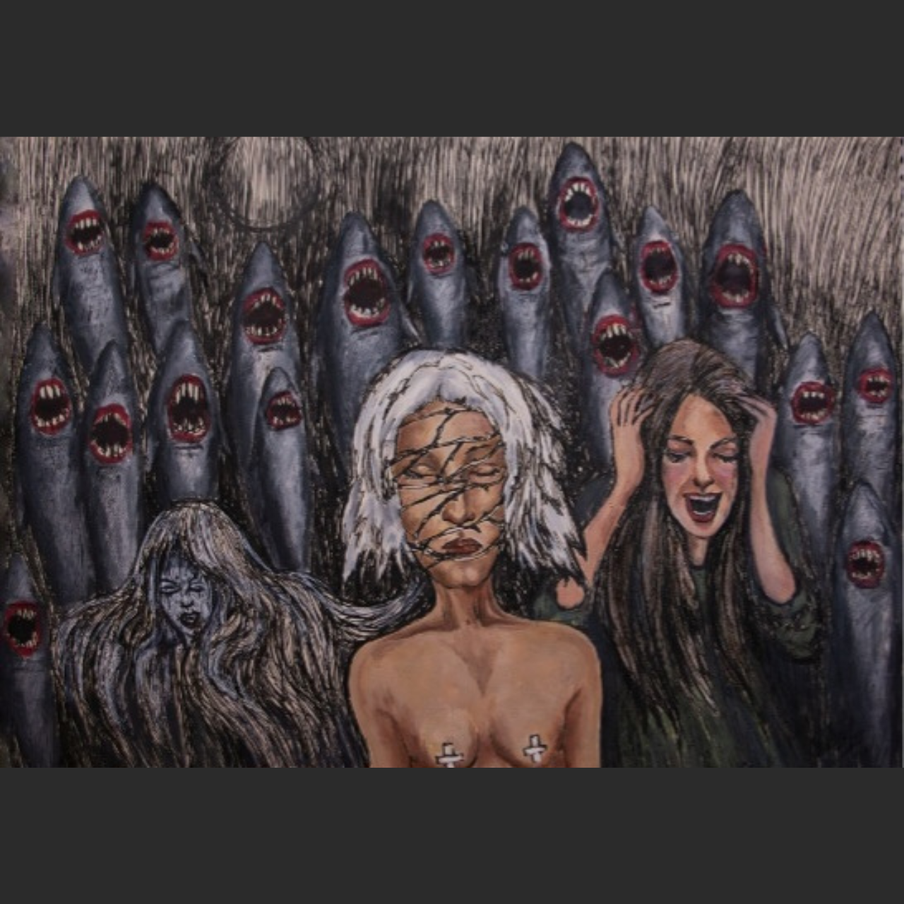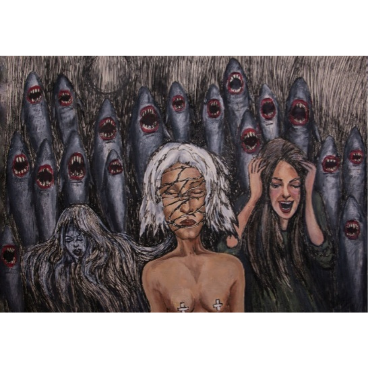 Scream captures a visceral moment of psychological and collective distress. Surrounded by ghostly, open-mouthed figures, three women stand in varying states of pain and resistance. The wrapped face, the silent scream, and the raw exposure speak to themes of silencing, trauma, and survival. Aeeni’s use of mixed media heightens the emotional charge, creating a stark, symbolic commentary on female suffering and endurance.