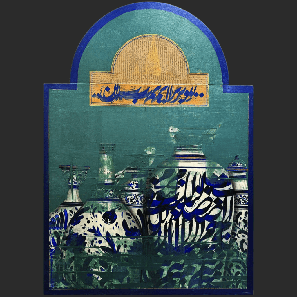 Description: Sepahsalar unfolds within a grand arch, evoking architectural grace and cultural weight. A cluster of vessels adorned with blue-and-white patterns and bold calligraphy creates rhythm and intricacy. A golden inscription band and delicate bird motifs add layers of symbolism. The muted teal background and textured surface merge heritage with a refined contemporary vision.