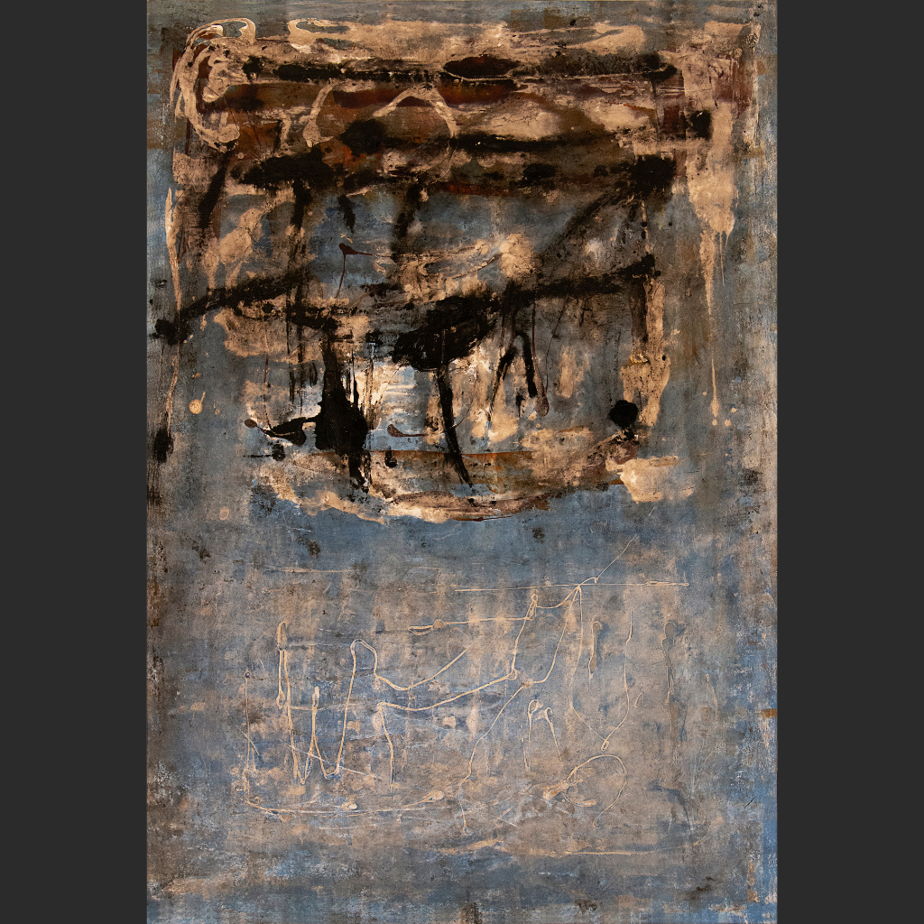 Description: In this composition from the Threshold of Feeling series, layers of deep blue and muted black interweave with carved linear gestures—delicate, almost archaeological. Faint human-like traces seem to rise from the underlayers, echoing memory, erosion, and emotional residue. Mostafa Khosravi builds a subtle yet charged atmosphere that invites the viewer into a space between visibility and disappearance.