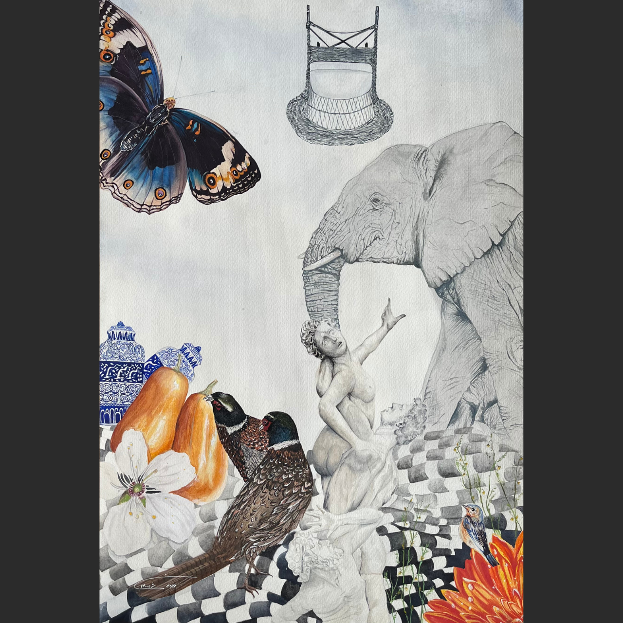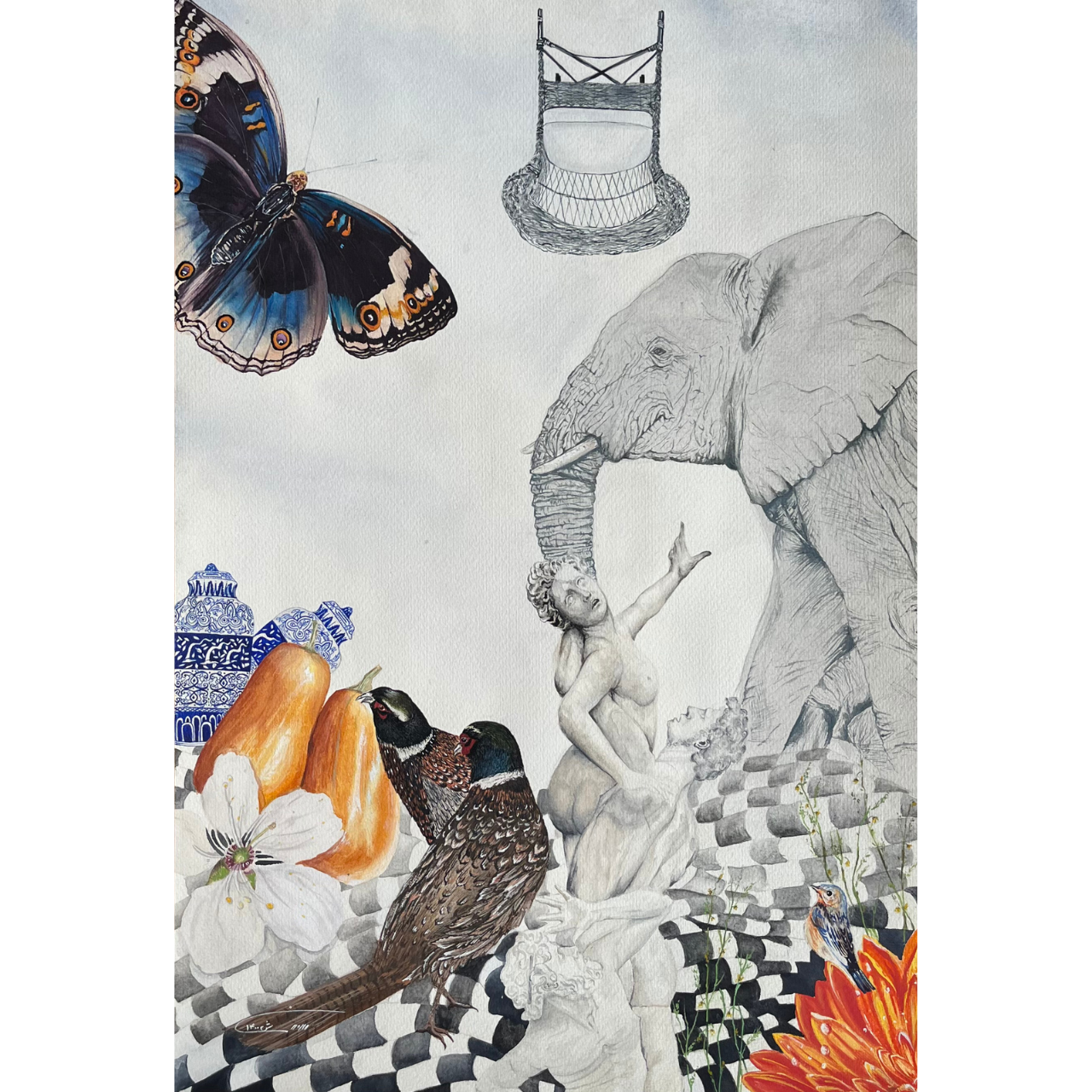 Description: This work by Simin Jafari intertwines the delicate transparency of watercolor with the boldness of gouache to create a surreal composition where nature, myth, and symbolism converge. A monumental elephant, rendered in subtle graphite-like tones, dominates the scene alongside classical figures, pears, and ornamental birds. A large butterfly hovers above, evoking fragility and transformation, while vivid blossoms anchor the image with bursts of color. Jafari’s layering of textures and imagery explores memory, symbolism, and the coexistence of life’s quiet beauty with monumental presence.