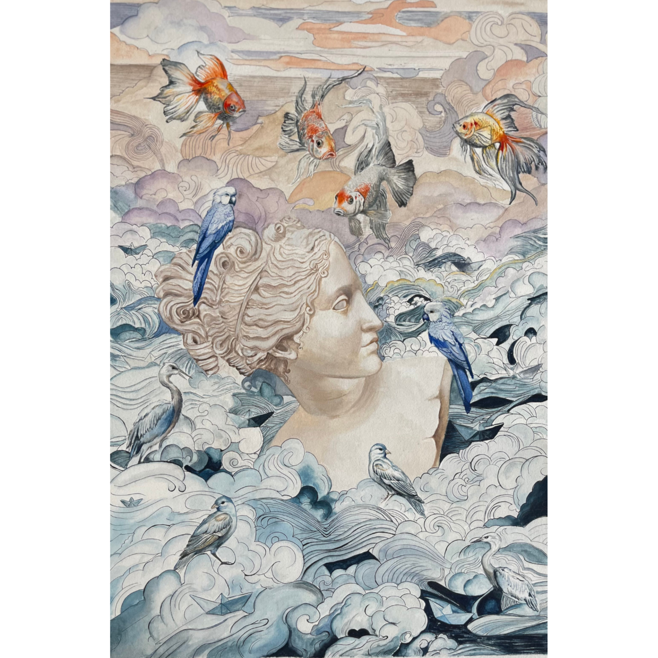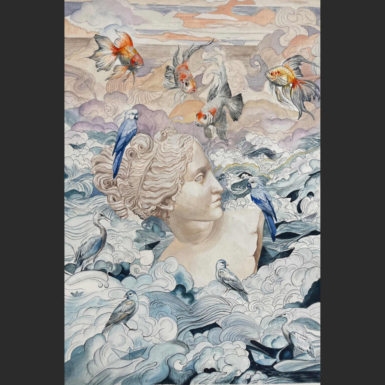 Description: This watercolor piece presents a serene yet surreal encounter between classical form and nature’s vitality. The bust of a timeless female figure emerges from turbulent seas, surrounded by birds, clouds, and vibrant goldfish that animate the sky above. Delicate pastel tones and fluid brushwork create a dreamlike harmony, where mythological echoes meet the living rhythms of water and air. The painting invites reflection on continuity, memory, and the coexistence of human imagination with natural wonder.