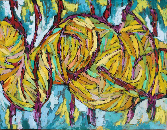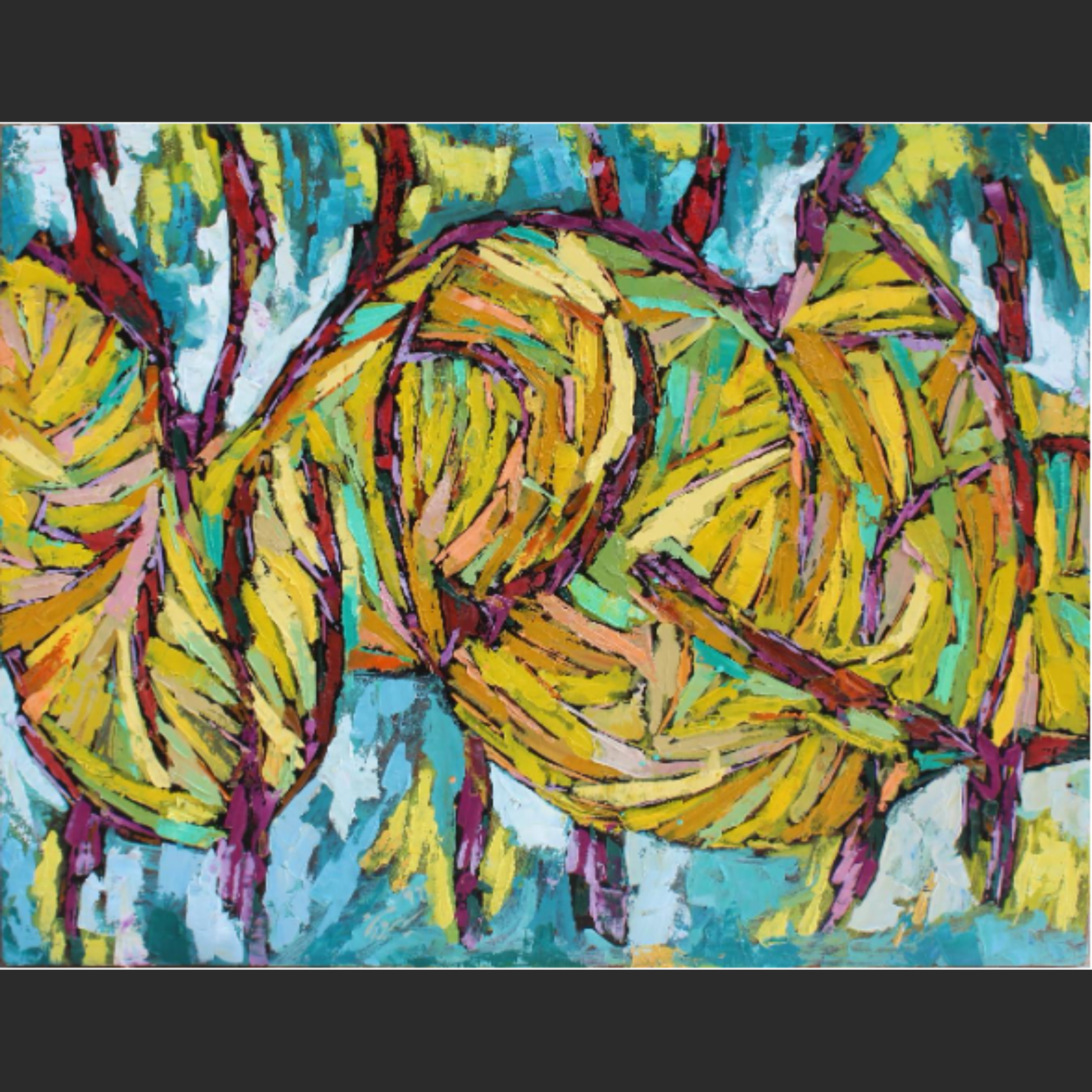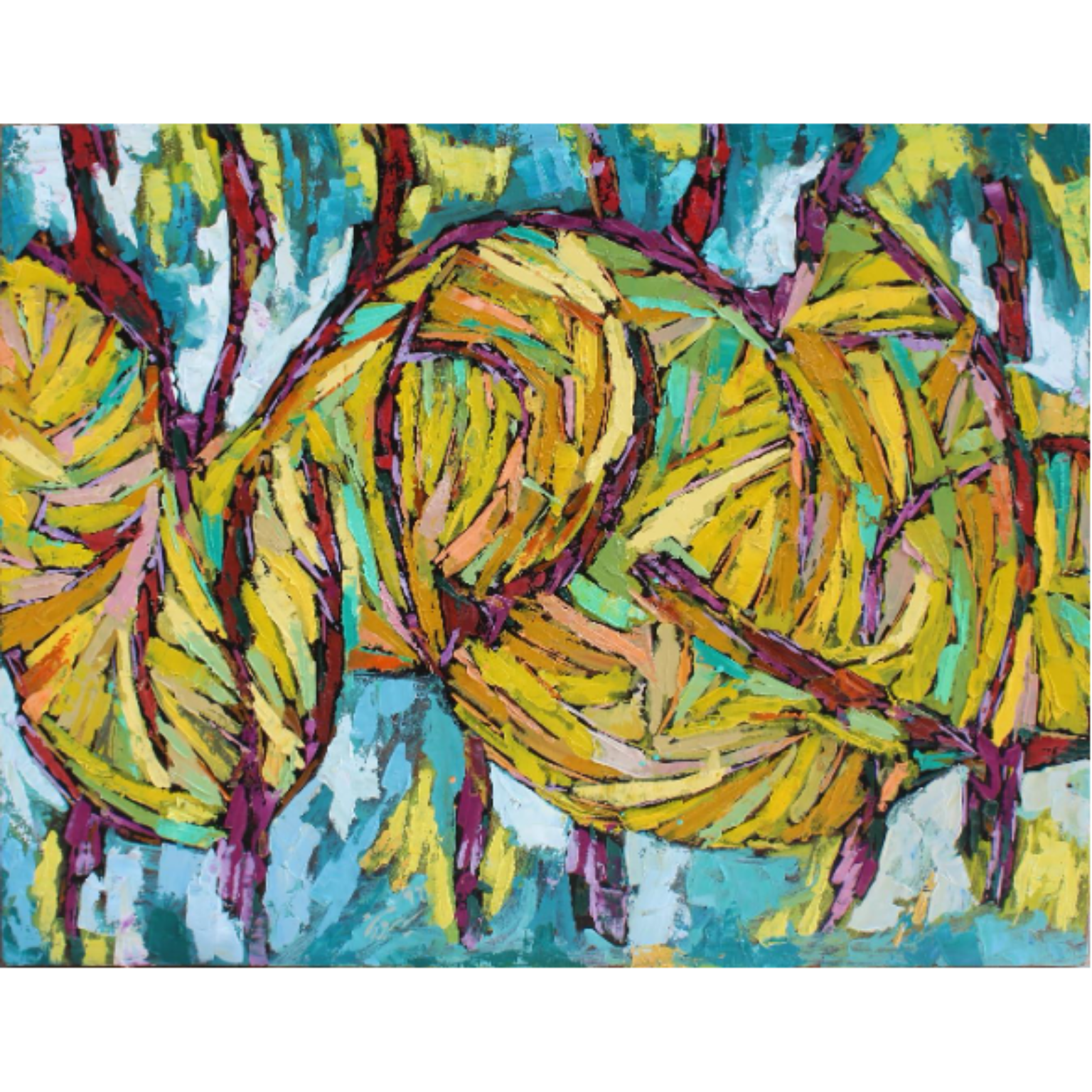 Description: A dynamic and expressive painting that captures the interplay between colors and nature. The work features bold brushstrokes and a vibrant color palette, creating a sense of movement and energy.