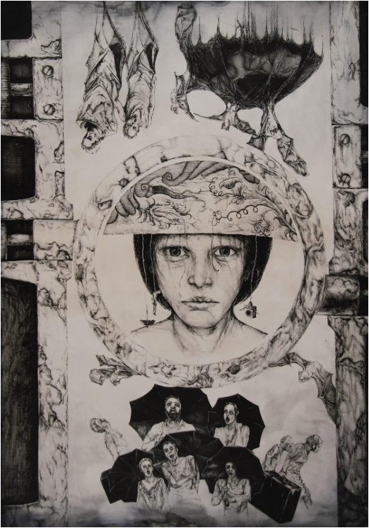 Description: A captivating piece that explores the concept of the unknown and the strange. The work features intricate details and a blend of watercolor and ink, creating a sense of mystery and intrigue.