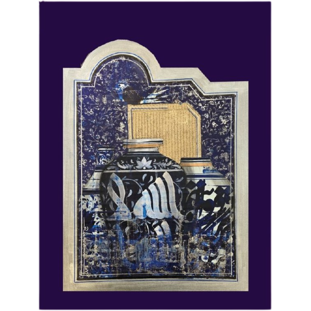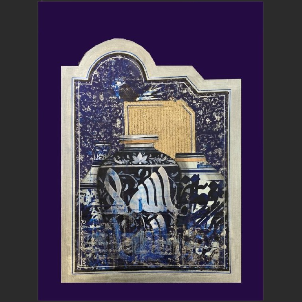 Description: "Tehran Villa" is a captivating work framed by an elegant, traditional arch, evoking a window into a bygone era. Dominating the composition are vessels richly adorned with bold blue and white calligraphic and floral patterns, their forms merging with a deeply textured background. A luminous gold panel in the upper section provides a striking contrast, while hints of metallic sheen and distressed textures create a sense of aged grandeur. The piece beautifully combines classical Persian aesthetics with a modern, layered approach, inviting contemplation on history and beauty.